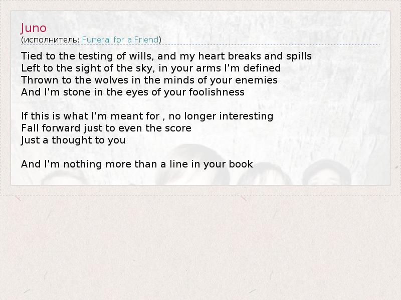 Это интересно:История Funeral for a Friend берёт начало в декабре 2001 года в городке Бридженд на юге Уэльса, когда ребята из местной молодёжной группы January Thirst пригласили Мэтта Дэвиса на роль второго вокалиста. Преданный поклонник стиля панк заметно разнообразил звучание группы, которая до его прихода играла только агрессивный метал."Моей мечтой всегда была возможность играть в группе, способной... продолжение