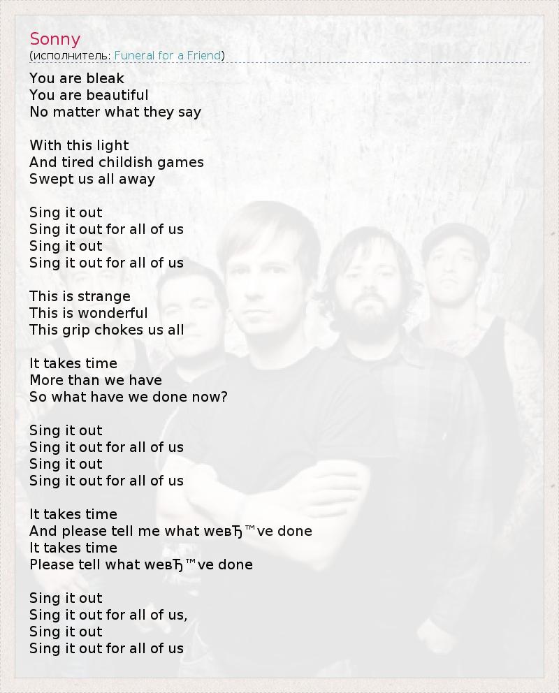 Это интересно:История Funeral for a Friend берёт начало в декабре 2001 года в городке Бридженд на юге Уэльса, когда ребята из местной молодёжной группы January Thirst пригласили Мэтта Дэвиса на роль второго вокалиста. Преданный поклонник стиля панк заметно разнообразил звучание группы, которая до его прихода играла только агрессивный метал."Моей мечтой всегда была возможность играть в группе, способной... продолжение