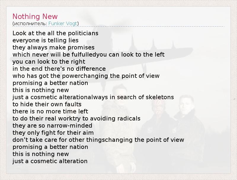 Look at the all the politicians everyone is telling lies they always make promises which never will be fulfulledyou can look to the left you can look to the right in the end there's no difference who has got the powerchanging the point of view promising a better nation this is nothing new just a cosmetic alterationalways in search of skeletons to hide their own faults there is no more time left to do their real worktry to avoiding radicals they are so narrow-minded they only fight for their aim don't take care for other thingschanging the point of view promising a better nation this is nothing new just a cosmetic alteration