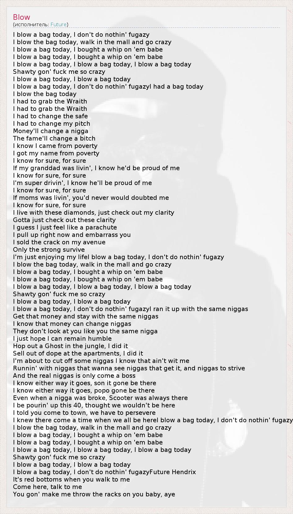 I blow a bag today, I don't do nothin' fugazy I blow the bag today, walk in the mall and go crazy I blow a bag today, I bought a whip on 'em babe I blow a bag today, I bought a whip on 'em babe I blow a bag today, I blow a bag today, I blow a bag today Shawty gon' fuck me so crazy I blow a bag today, I blow a bag today I blow a bag today, I don't do nothin' fugazyI had a bag today I blow the bag today I had to grab the Wraith I had to grab the Wraith I had to change the safe I had to change my pitch Money'll change a nigga The fame'll change a bitch I know I came from poverty I got my name from poverty I know for sure, for sure If my granddad was livin', I know he'd be proud of me I know for sure, for sure I'm super drivin', I know he'll be proud of me I know for sure, for sure If moms was livin', you'd never would doubted me I know for sure, for sure I live with these diamonds, just check out my clarity Gotta just check out these clarity I guess I just feel like a parachute I pull up right now and embarrass you I sold the crack on my avenue Only the strong survive I'm just enjoying my lifeI blow a bag today, I don't do nothin' fugazy I blow the bag today, walk in the mall and go crazy I blow a bag today, I bought a whip on 'em babe I blow a bag today, I bought a whip on 'em babe I blow a bag today, I blow a bag today, I blow a bag today Shawty gon' fuck me so crazy I blow a bag today, I blow a bag today I blow a bag today, I don't do nothin' fugazyI ran it up with the same niggas Get that money and stay with the same niggas I know that money can change niggas They don't look at you like you the same nigga I just hope I can remain humble Hop out a Ghost in the jungle, I did it Sell out of dope at the apartments, I did it I'm about to cut off some niggas I know that ain't wit me Runnin' with niggas that wanna see niggas that get it, and niggas to strive And the real niggas is only come a boss I know either way it goes, son it gone be there I know either way it goes, popo gone be there Even when a nigga was broke, Scooter was always there I be pourin' up this 40, thought we wouldn't be here I told you come to town, we have to persevere I knew there come a time when we all be hereI blow a bag today, I don't do nothin' fugazy I blow the bag today, walk in the mall and go crazy I blow a bag today, I bought a whip on 'em babe I blow a bag today, I bought a whip on 'em babe I blow a bag today, I blow a bag today, I blow a bag today Shawty gon' fuck me so crazy I blow a bag today, I blow a bag today I blow a bag today, I don't do nothin' fugazyFuture Hendrix It's red bottoms when you walk to me Come here, talk to me You gon' make me throw the racks on you baby, aye