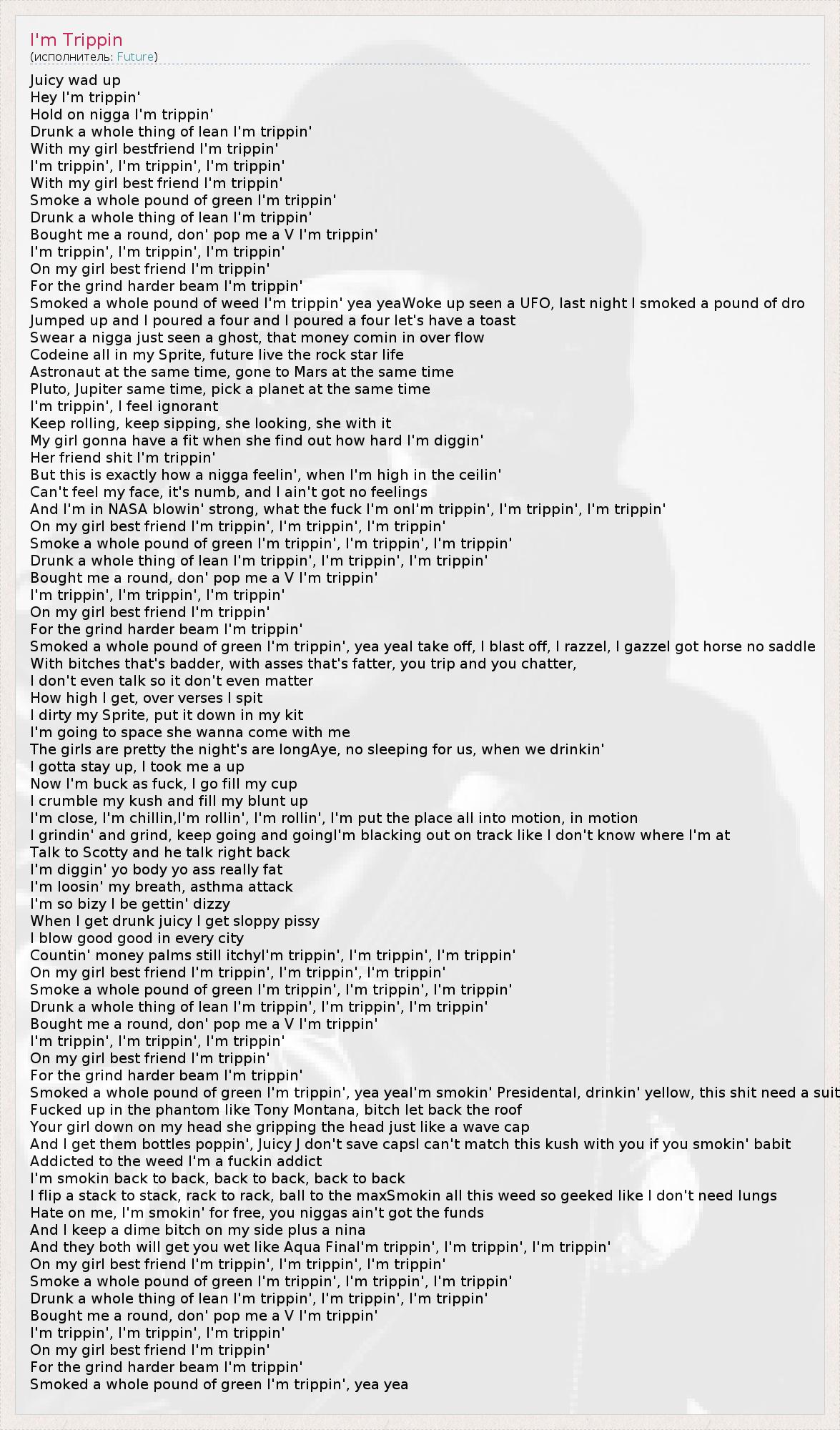 And I'm in NASA blowin' strong, what the fuck I'm onI'm trippin', I'm trippin', I'm trippin'