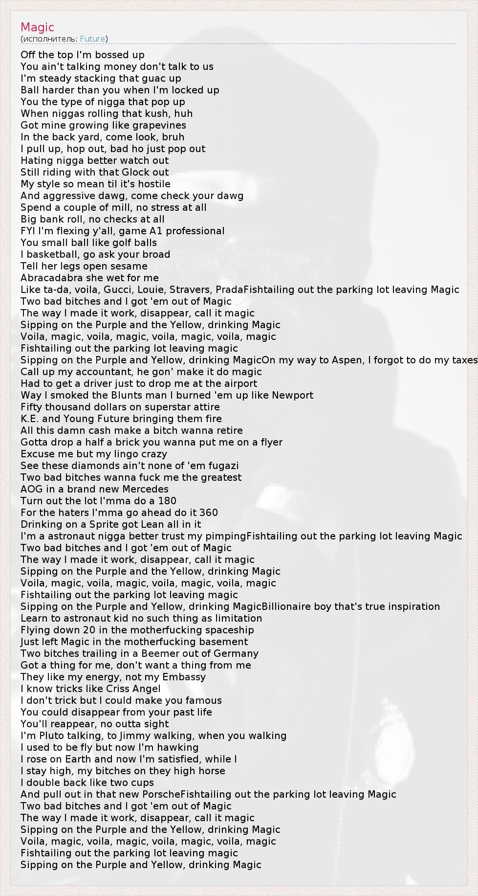 Это интересно:Nayvadius Cash (born Nayvadius Wilburn on November 20, 1985), better known by his stage name Future is an American rapper from Kirkwood, Atlanta, Georgia. He is currently signed to the record label Epic Records.His name was came about after members of The Dungeon Family called him "The Future" . His cousin, producer Rico Wade of Dungeon Family, encouraged him to sharpen his writing skills and pursue music.From 2010 to early 2011, Future released a series of mixtapes including 1000, Dirty Sprite and True Story.The latter included the single "Tony Montana", in reference to the Scarface film. During this time, Future also partnered with Gucci Mane on the Free Bricks collaborative... продолжение