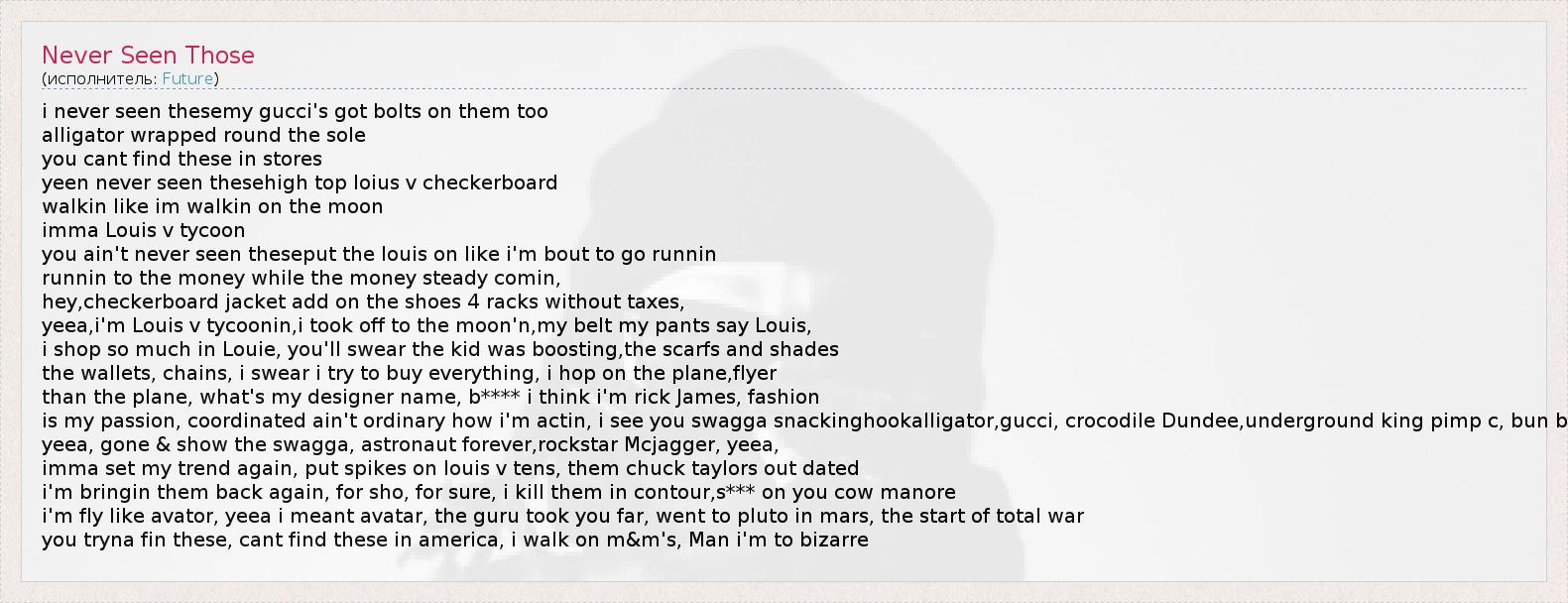 i never seen thesemy gucci's got bolts on them too alligator wrapped round the sole you cant find these in stores yeen never seen thesehigh top loius v checkerboard walkin like im walkin on the moon imma Louis v tycoon you ain't never seen theseput the louis on like i'm bout to go runnin runnin to the money while the money steady comin, hey,checkerboard jacket add on the shoes 4 racks without taxes, yeea,i'm Louis v tycoonin,i took off to the moon'n,my belt my pants say Louis, i shop so much in Louie, you'll swear the kid was boosting,the scarfs and shades the wallets, chains, i swear i try to buy everything, i hop on the plane,flyer than the plane, what's my designer name, b**** i think i'm rick James, fashion is my passion, coordinated ain't ordinary how i'm actin, i see you swagga snackinghookalligator,gucci, crocodile Dundee,underground king pimp c, bun b yeea, gone & show the swagga, astronaut forever,rockstar Mcjagger, yeea, imma set my trend again, put spikes on louis v tens, them chuck taylors out dated i'm bringin them back again, for sho, for sure, i kill them in contour,s*** on you cow manore i'm fly like avator, yeea i meant avatar, the guru took you far, went to pluto in mars, the start of total war you tryna fin these, cant find these in america, i walk on m&m's, Man i'm to bizarre