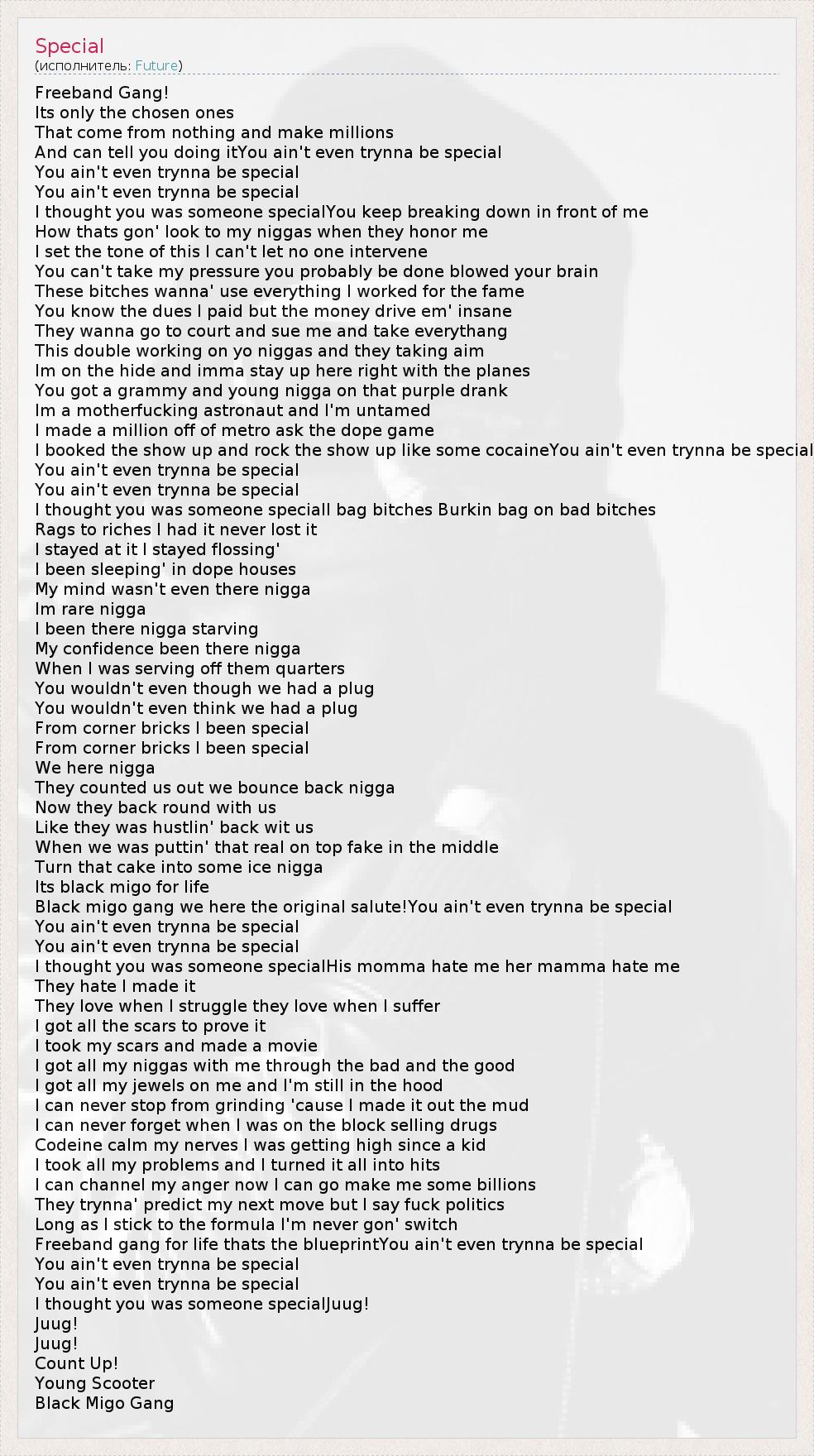 Это интересно:Nayvadius Cash (born Nayvadius Wilburn on November 20, 1985), better known by his stage name Future is an American rapper from Kirkwood, Atlanta, Georgia. He is currently signed to the record label Epic Records.His name was came about after members of The Dungeon Family called him "The Future" . His cousin, producer Rico Wade of Dungeon Family, encouraged him to sharpen his writing skills and pursue music.From 2010 to early 2011, Future released a series of mixtapes including 1000, Dirty Sprite and True Story.The latter included the single "Tony Montana", in reference to the Scarface film. During this time, Future also partnered with Gucci Mane on the Free Bricks collaborative... продолжение