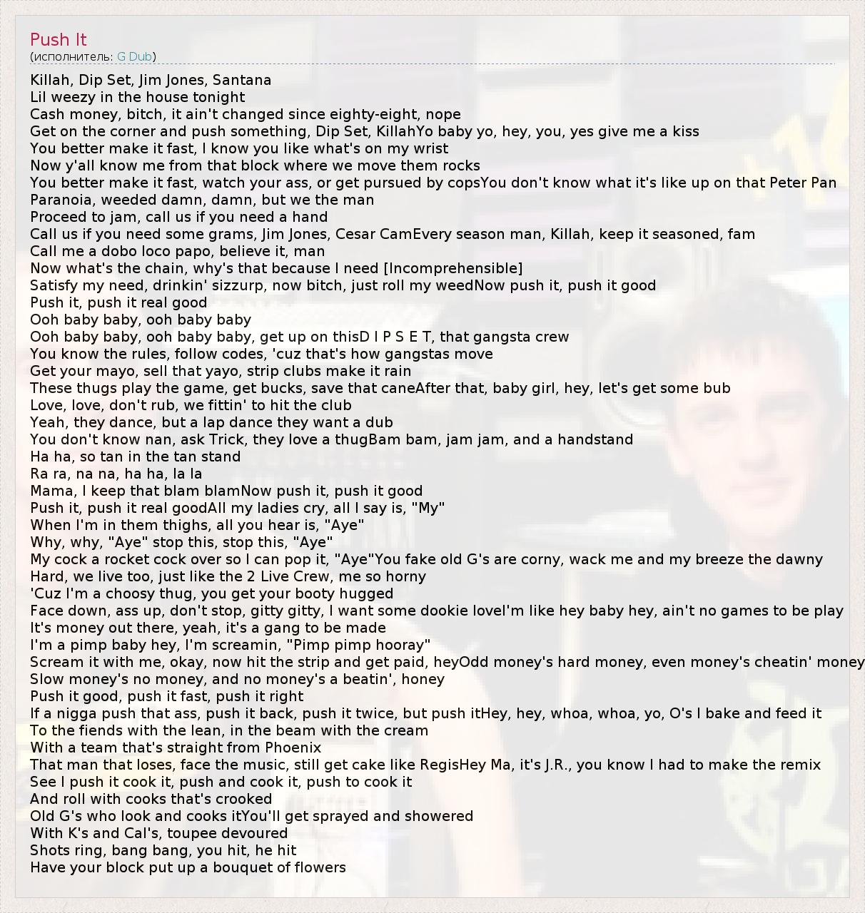 Satisfy my need, drinkin' sizzurp, now bitch, just roll my weedNow push it, push it good