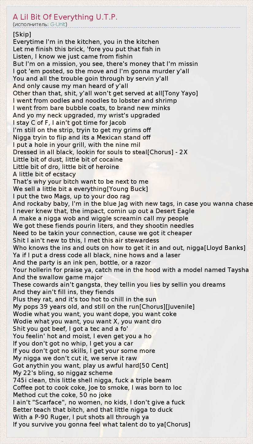 [Skip] Everytime I'm in the kitchen, you in the kitchen Let me finish this brick, 'fore you put that fish in Listen, I know we just came from fishin But I'm on a mission, you see, there's money that I'm missin I got 'em posted, so the move and I'm gonna murder y'all You and all the trouble goin through by servin y'all And only cause my man heard of y'all Other than that, shit, y'all won't get served at all[Tony Yayo] I went from oodles and noodles to lobster and shrimp I went from bare bubble coats, to brand new minks And yo my neck upgraded, my wrist's upgraded I stay C of F, I ain't got time for Jacob I'm still on the strip, tryin to get my grims off Nigga tryin to flip and its a Mexican stand off I put a hole in your grill, with the nine mil Dressed in all black, lookin for souls to steal[Chorus] - 2X Little bit of dust, little bit of cocaine Little bit of dro, little bit of heroine A little bit of ecstacy That's why your bitch want to be next to me We sell a little bit a everything[Young Buck] I put the two Mags, up to your doo rag And rockaby baby, I'm in the blue Jag with new tags, in case you wanna chase I never knew that, the impact, comin up out a Desert Eagle A make a nigga wob and wiggle screamin call my people We got these fiends pourin liters, and they shootin needles Need to be takin your connection, cause we got it cheaper Shit I ain't new to this, I met this air stewardess Who knows the ins and outs on how to get it in and out, nigga[Lloyd Banks] Ya if I put a dress code all black, nine hows and a laser And the party is an ink pen, bottle, or a razor Your hollerin for praise ya, catch me in the hood with a model named Taysha And the swallow game major These cowards ain't gangsta, they tellin you lies by sellin you dreams And they ain't fill ins, they fiends Plus they rat, and it's too hot to chill in the sun My pops 39 years old, and still on the run[Chorus][Juvenile] Wodie what you want, you want dope, you want coke Wodie what you want, you want X, you want dro Shit you got beef, I got a tec and a fo' You feelin' hot and moist, I even get you a ho If you don't got no whip, I get you a car If you don't got no skills, I get your some more My nigga we don't cut it, we serve it raw Got anythin you want, play us awful hard[50 Cent] My 22's bling, so niggaz scheme 745i clean, this little shell nigga, fuck a triple beam Coffee pot to cook coke, Joe to smoke, I was born to loc Method cut the coke, 50 no joke I ain't "Scarface", no women, no kids, I don't give a fuck Better teach that bitch, and that little nigga to duck With a P-90 Ruger, I put shots all through ya If you survive you gonna feel what talent do to ya[Chorus]