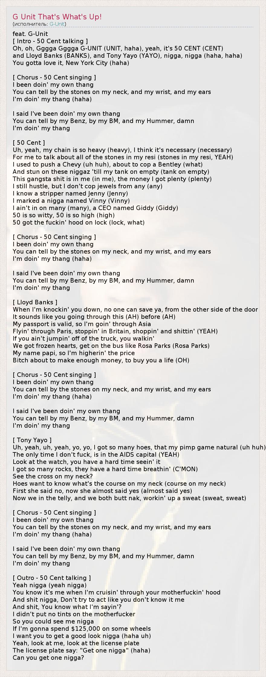 feat. G-Unit [ Intro - 50 Cent talking ] Oh, oh, Gggga Gggga G-UNIT (UNIT, haha), yeah, it's 50 CENT (CENT) and Lloyd Banks (BANKS), and Tony Yayo (YAYO), nigga, nigga (haha, haha) You gotta love it, New York City (haha) [ Chorus - 50 Cent singing ] I been doin' my own thang You can tell by the stones on my neck, and my wrist, and my ears I'm doin' my thang (haha) I said I've been doin' my own thang You can tell by my Benz, by my BM, and my Hummer, damn I'm doin' my thang [ 50 Cent ] Uh, yeah, my chain is so heavy (heavy), I think it's necessary (necessary) For me to talk about all of the stones in my resi (stones in my resi, YEAH) I used to push a Chevy (uh huh), about to cop a Bentley (what) And stun on these niggaz 'till my tank on empty (tank on empty) This gangsta shit is in me (in me), the money I got plenty (plenty) I still hustle, but I don't cop jewels from any (any) I know a stripper named Jenny (Jenny) I marked a nigga named Vinny (Vinny) I ain't in on many (many), a CEO named Giddy (Giddy) 50 is so witty, 50 is so high (high) 50 got the fuckin' hood on lock (lock, what) [ Chorus - 50 Cent singing ] I been doin' my own thang You can tell by the stones on my neck, and my wrist, and my ears I'm doin' my thang (haha) I said I've been doin' my own thang You can tell by my Benz, by my BM, and my Hummer, damn I'm doin' my thang [ Lloyd Banks ] When I'm knockin' you down, no one can save ya, from the other side of the door It sounds like you going through this (AH) before (AH) My passport is valid, so I'm goin' through Asia Flyin' through Paris, stoppin' in Britain, shoppin' and shittin' (YEAH) If you ain't jumpin' off of the truck, you walkin' We got frozen hearts, get on the bus like Rosa Parks (Rosa Parks) My name papi, so I'm higherin' the price Bitch about to make enough money, to buy you a life (OH) [ Chorus - 50 Cent singing ] I been doin' my own thang You can tell by the stones on my neck, and my wrist, and my ears I'm doin' my thang (haha) I said I've been doin' my own thang You can tell by my Benz, by my BM, and my Hummer, damn I'm doin' my thang [ Tony Yayo ] Uh, yeah, uh, yeah, yo, yo, I got so many hoes, that my pimp game natural (uh huh) The only time I don't fuck, is in the AIDS capital (YEAH) Look at the watch, you have a hard time seein' it I got so many rocks, they have a hard time breathin' (C'MON) See the cross on my neck? Hoes want to know what's the course on my neck (course on my neck) First she said no, now she almost said yes (almost said yes) Now we in the telly, and we both butt nak, workin' up a sweat (sweat, sweat) [ Chorus - 50 Cent singing ] I been doin' my own thang You can tell by the stones on my neck, and my wrist, and my ears I'm doin' my thang (haha) I said I've been doin' my own thang You can tell by my Benz, by my BM, and my Hummer, damn I'm doin' my thang [ Outro - 50 Cent talking ] Yeah nigga (yeah nigga) You know it's me when I'm cruisin' through your motherfuckin' hood And shit nigga, Don't try to act like you don't know it me And shit, You know what I'm sayin'? I didn't put no tints on the motherfucker So you could see me nigga If I'm gonna spend $125,000 on some wheels I want you to get a good look nigga (haha uh) Yeah, look at me, look at the license plate The license plate say: "Get one nigga" (haha) Can you get one nigga?
