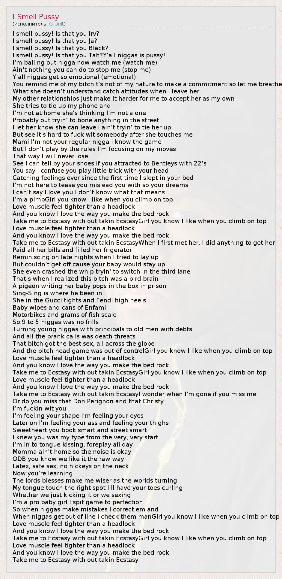 I smell pussy! Is that you Irv? I smell pussy! Is that you Ja? I smell pussy! Is that you Black? I smell pussy! Is that you Tah?Y'all niggas is pussy! I'm balling out nigga now watch me (watch me) Ain't nothing you can do to stop me (stop me) Y'all niggas get so emotional (emotional) You remind me of my bitchIt's not of my nature to make a commitment so let me breathe What she doesn't understand catch attitudes when I leave her My other relationships just make it harder for me to accept her as my own She tries to tie up my phone and I'm not at home she's thinking I'm not alone Probably out tryin' to bone anything in the street I let her know she can leave I ain't tryin' to tie her up But see it's hard to fuck wit somebody after she touches me Mami I'm not your regular nigga I know the game But I don't play by the rules I'm focusing on my moves That way I will never lose See I can tell by your shoes if you attracted to Bentleys with 22's You say I confuse you play little trick with your head Catching feelings ever since the first time I slept in your bed I'm not here to tease you mislead you with so your dreams I can't say I love you I don't know what that means I'm a pimpGirl you know I like when you climb on top Love muscle feel tighter than a headlock And you know I love the way you make the bed rock Take me to Ecstasy with out takin EcstasyGirl you know I like when you climb on top Love muscle feel tighter than a headlock And you know I love the way you make the bed rock Take me to Ecstasy with out takin EcstasyWhen I first met her, I did anything to get her Paid all her bills and filled her frigerator Reminiscing on late nights when I tried to lay up But couldn't get off cause your baby would stay up She even crashed the whip tryin' to switch in the third lane That's when I realized this bitch was a bird brain A pigeon writing her baby pops in the box in prison Sing-Sing is where he been in She in the Gucci tights and Fendi high heels Baby wipes and cans of Enfamil Motorbikes and grams of fish scale So 9 to 5 niggas was no frills Turning young niggas with principals to old men with debts And all the prank calls was death threats That bitch got the best sex, all across the globe And the bitch head game was out of controlGirl you know I like when you climb on top Love muscle feel tighter than a headlock And you know I love the way you make the bed rock Take me to Ecstasy with out takin EcstasyGirl you know I like when you climb on top Love muscle feel tighter than a headlock And you know I love the way you make the bed rock Take me to Ecstasy with out takin EcstasyI wonder when I'm gone if you miss me Or do you miss that Don Perignon and that Christy I'm fuckin wit you I'm feeling your shape I'm feeling your eyes Later on I'm feeling your ass and feeling your thighs Sweetheart you book smart and street smart I knew you was my type from the very, very start I'm in to tongue kissing, foreplay all day Momma ain't home so the noise is okay ODB you know we like it the raw way Latex, safe sex, no hickeys on the neck Now you're learning The lords blesses make me wiser as the worlds turning My tongue touch the right spot I'll have your toes curling Whether we just kicking it or we sexing I'm a pro baby girl I spit game to perfection So when niggas make mistakes I correct em and When niggas get out of line I check them manGirl you know I like when you climb on top Love muscle feel tighter than a headlock And you know I love the way you make the bed rock Take me to Ecstasy with out takin EcstasyGirl you know I like when you climb on top Love muscle feel tighter than a headlock And you know I love the way you make the bed rock Take me to Ecstasy with out takin Ecstasy