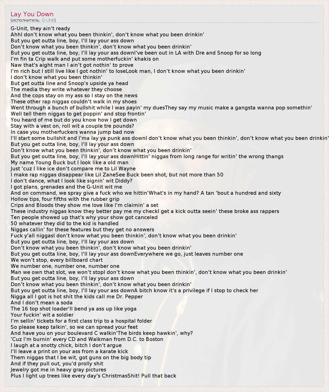 Это интересно:G-Unit (то есть Gorilla Unit, а не Guerilla или Gangsta Unit, как многие думают) – это рэп-группа, в которую входят 50 Cent, Lloyd Banks, Tony Yayo и Young Buck. Стиль группы довольно разнообразен, от жёстких уличных тем до клубных записей, от любовных песенок до суровых рассказов о продаже наркоты. В самом начале группа состояла из троих рэпперов; Young Buck присоединился к группе, после того как Tony Yayo был арестован за незаконное... продолжение