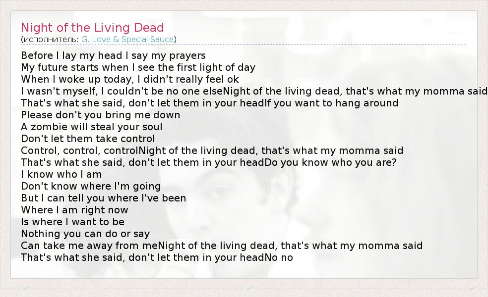 Before I lay my head I say my prayers My future starts when I see the first light of day When I woke up today, I didn't really feel ok I wasn't myself, I couldn't be no one elseNight of the living dead, that's what my momma said That's what she said, don't let them in your headIf you want to hang around Please don't you bring me down A zombie will steal your soul Don't let them take control Control, control, controlNight of the living dead, that's what my momma said That's what she said, don't let them in your headDo you know who you are? I know who I am Don't know where I'm going But I can tell you where I've been Where I am right now Is where I want to be Nothing you can do or say Can take me away from meNight of the living dead, that's what my momma said That's what she said, don't let them in your headNo no