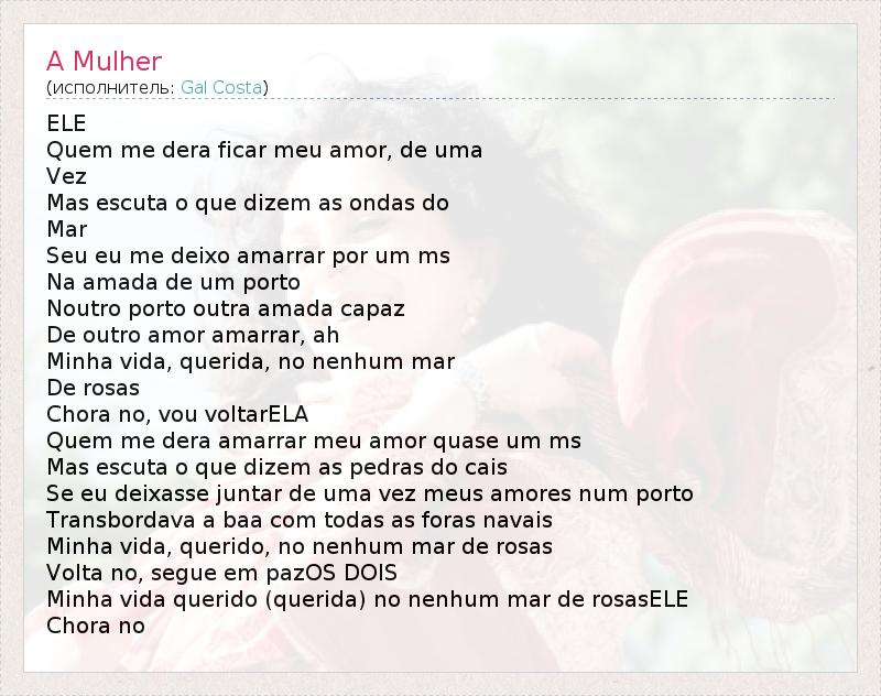 ELE Quem me dera ficar meu amor, de uma Vez Mas escuta o que dizem as ondas do Mar Seu eu me deixo amarrar por um ms Na amada de um porto Noutro porto outra amada capaz De outro amor amarrar, ah Minha vida, querida, no nenhum mar De rosas Chora no, vou voltarELA Quem me dera amarrar meu amor quase um ms Mas escuta o que dizem as pedras do cais Se eu deixasse juntar de uma vez meus amores num porto Transbordava a baa com todas as foras navais Minha vida, querido, no nenhum mar de rosas Volta no, segue em pazOS DOIS Minha vida querido (querida) no nenhum mar de rosasELE Chora no