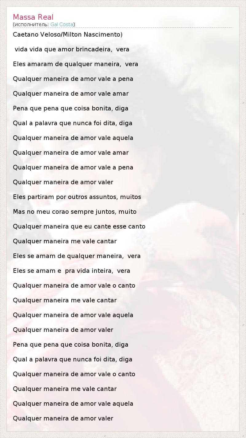 Caetano Veloso/Milton Nascimento) vida vida que amor brincadeira, vera Eles amaram de qualquer maneira, vera Qualquer maneira de amor vale a pena Qualquer maneira de amor vale amar Pena que pena que coisa bonita, diga Qual a palavra que nunca foi dita, diga Qualquer maneira de amor vale aquela Qualquer maneira de amor vale amar Qualquer maneira de amor vale a pena Qualquer maneira de amor valer Eles partiram por outros assuntos, muitos Mas no meu corao sempre juntos, muito Qualquer maneira que eu cante esse canto Qualquer maneira me vale cantar Eles se amam de qualquer maneira, vera Eles se amam e pra vida inteira, vera Qualquer maneira de amor vale o canto Qualquer maneira me vale cantar Qualquer maneira de amor vale aquela Qualquer maneira de amor valer Pena que pena que coisa bonita, diga Qual a palavra que nunca foi dita, diga Qualquer maneira de amor vale o canto Qualquer maneira me vale cantar Qualquer maneira de amor vale aquela Qualquer maneira de amor valer