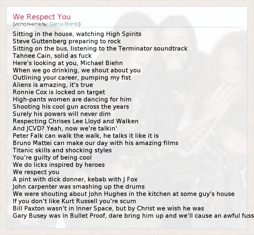 Sitting in the house, watching High Spirits Steve Guttenberg preparing to rock Sitting on the bus, listening to the Terminator soundtrack Tahnee Cain, solid as fuck Here's looking at you, Michael Biehn When we go drinking, we shout about you Outlining your career, pumping my fist Aliens is amazing, it's true Ronnie Cox is locked on target High-pants women are dancing for him Shooting his cool gun across the years Surely his powers will never dim Respecting Chrises Lee Lloyd and Walken And JCVD? Yeah, now we're talkin' Peter Falk can walk the walk, he talks it like it is Bruno Mattei can make our day with his amazing films Titanic skills and shocking styles You're guilty of being cool We do licks inspired by heroes We respect you A pint with dick donner, kebab with J Fox John carpenter was smashing up the drums We were shouting about John Hughes in the kitchen at some guy's house If you don't like Kurt Russell you're scum Bill Paxton wasn't in Inner Space, but by Christ we wish he was Gary Busey was in Bullet Proof, dare bring him up and we'll cause an awful fuss