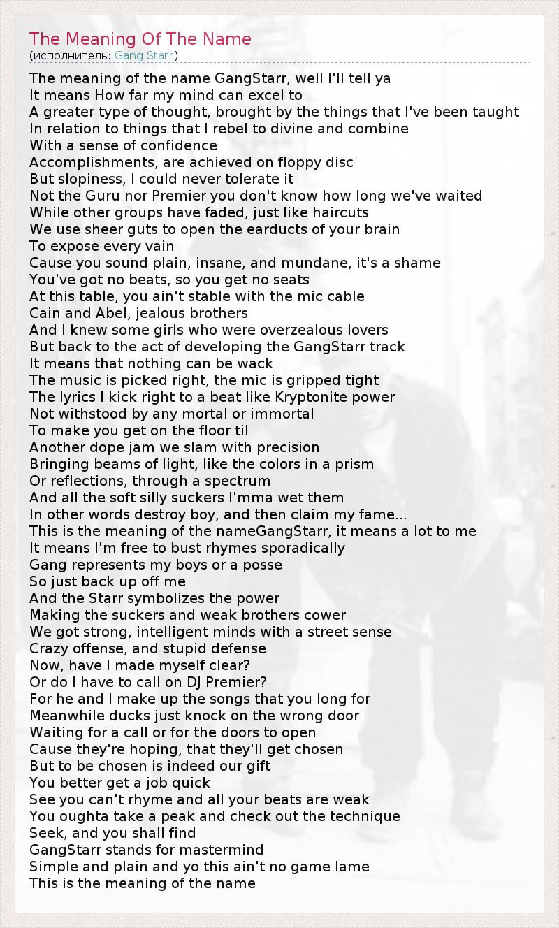 The meaning of the name GangStarr, well I'll tell ya It means How far my mind can excel to A greater type of thought, brought by the things that I've been taught In relation to things that I rebel to divine and combine With a sense of confidence Accomplishments, are achieved on floppy disc But slopiness, I could never tolerate it Not the Guru nor Premier you don't know how long we've waited While other groups have faded, just like haircuts We use sheer guts to open the earducts of your brain To expose every vain Cause you sound plain, insane, and mundane, it's a shame You've got no beats, so you get no seats At this table, you ain't stable with the mic cable Cain and Abel, jealous brothers And I knew some girls who were overzealous lovers But back to the act of developing the GangStarr track It means that nothing can be wack The music is picked right, the mic is gripped tight The lyrics I kick right to a beat like Kryptonite power Not withstood by any mortal or immortal To make you get on the floor til Another dope jam we slam with precision Bringing beams of light, like the colors in a prism Or reflections, through a spectrum And all the soft silly suckers I'mma wet them In other words destroy boy, and then claim my fame... This is the meaning of the nameGangStarr, it means a lot to me It means I'm free to bust rhymes sporadically Gang represents my boys or a posse So just back up off me And the Starr symbolizes the power Making the suckers and weak brothers cower We got strong, intelligent minds with a street sense Crazy offense, and stupid defense Now, have I made myself clear? Or do I have to call on DJ Premier? For he and I make up the songs that you long for Meanwhile ducks just knock on the wrong door Waiting for a call or for the doors to open Cause they're hoping, that they'll get chosen But to be chosen is indeed our gift You better get a job quick See you can't rhyme and all your beats are weak You oughta take a peak and check out the technique Seek, and you shall find GangStarr stands for mastermind Simple and plain and yo this ain't no game lame This is the meaning of the name