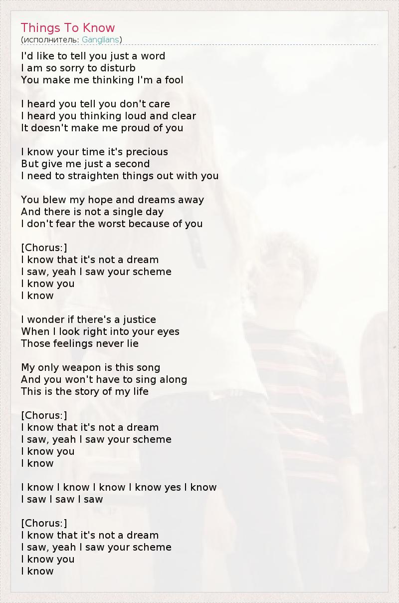 Я бы хотела кое-что сказать тебе. Мне очень неудобно тебя беспокоить, Но ты заставляешь меня чувствовать себя дурой. Я слышала, как ты говорил, что тебе всё равно, Я даже слышала, как ты отчётливо думал об этом, И после этого я вряд ли буду гордиться тобой. Я знаю, что тебе дорога каждая минута, Но дай мне хоть секунду - Нам нужно расставить точки над "и". Ты прогнал мои надежды и мечты, И не проходит и дня, Чтобы я не опасалась худшего из-за тебя... [Припев:] Я знаю, что это не сон, Я поняла, да, я поняла твой замысел. Я знаю тебя, Я знаю... Интересно, есть ли справедливость. Когда я смотрю тебе в глаза, Эти чувства никогда не лгут... Моё единственное оружие - эта песня, И тебе не придётся подпевать: Это история моéй жизни. [Припев:] Я знаю, что это не сон, Я поняла, да, я поняла твой замысел. Я знаю тебя, Я знаю... Я знаю, я знаю, да, я знаю, Я поняла, поняла, поняла... [Припев:] Я знаю, что это не сон, Я поняла, да, я поняла твой замысел. Я знаю тебя, Я знаю...