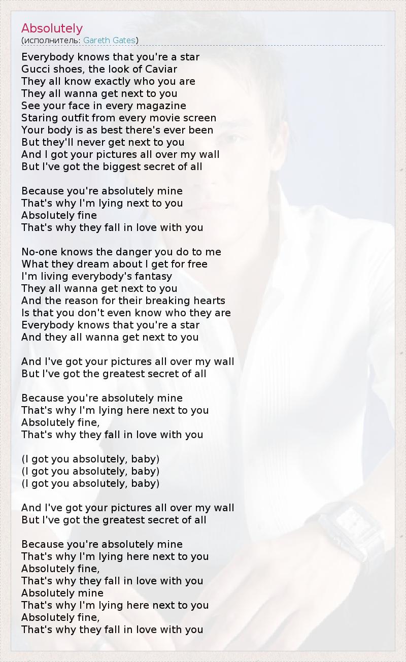 Everybody knows that you're a star Gucci shoes, the look of Caviar They all know exactly who you are They all wanna get next to you See your face in every magazine Staring outfit from every movie screen Your body is as best there's ever been But they'll never get next to you And I got your pictures all over my wall But I've got the biggest secret of all Because you're absolutely mine That's why I'm lying next to you Absolutely fine That's why they fall in love with you No-one knows the danger you do to me What they dream about I get for free I'm living everybody's fantasy They all wanna get next to you And the reason for their breaking hearts Is that you don't even know who they are Everybody knows that you're a star And they all wanna get next to you And I've got your pictures all over my wall But I've got the greatest secret of all Because you're absolutely mine That's why I'm lying here next to you Absolutely fine, That's why they fall in love with you (I got you absolutely, baby) (I got you absolutely, baby) (I got you absolutely, baby) And I've got your pictures all over my wall But I've got the greatest secret of all Because you're absolutely mine That's why I'm lying here next to you Absolutely fine, That's why they fall in love with you Absolutely mine That's why I'm lying here next to you Absolutely fine, That's why they fall in love with you