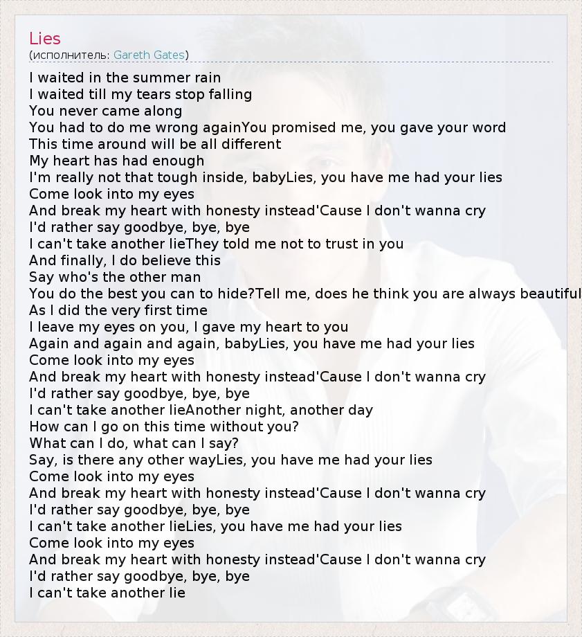 I waited in the summer rain I waited till my tears stop falling You never came along You had to do me wrong againYou promised me, you gave your word This time around will be all different My heart has had enough I'm really not that tough inside, babyLies, you have me had your lies Come look into my eyes And break my heart with honesty instead'Cause I don't wanna cry I'd rather say goodbye, bye, bye I can't take another lieThey told me not to trust in you And finally, I do believe this Say who's the other man You do the best you can to hide?Tell me, does he think you are always beautiful As I did the very first time I leave my eyes on you, I gave my heart to you Again and again and again, babyLies, you have me had your lies Come look into my eyes And break my heart with honesty instead'Cause I don't wanna cry I'd rather say goodbye, bye, bye I can't take another lieAnother night, another day How can I go on this time without you? What can I do, what can I say? Say, is there any other wayLies, you have me had your lies Come look into my eyes And break my heart with honesty instead'Cause I don't wanna cry I'd rather say goodbye, bye, bye I can't take another lieLies, you have me had your lies Come look into my eyes And break my heart with honesty instead'Cause I don't wanna cry I'd rather say goodbye, bye, bye I can't take another lie