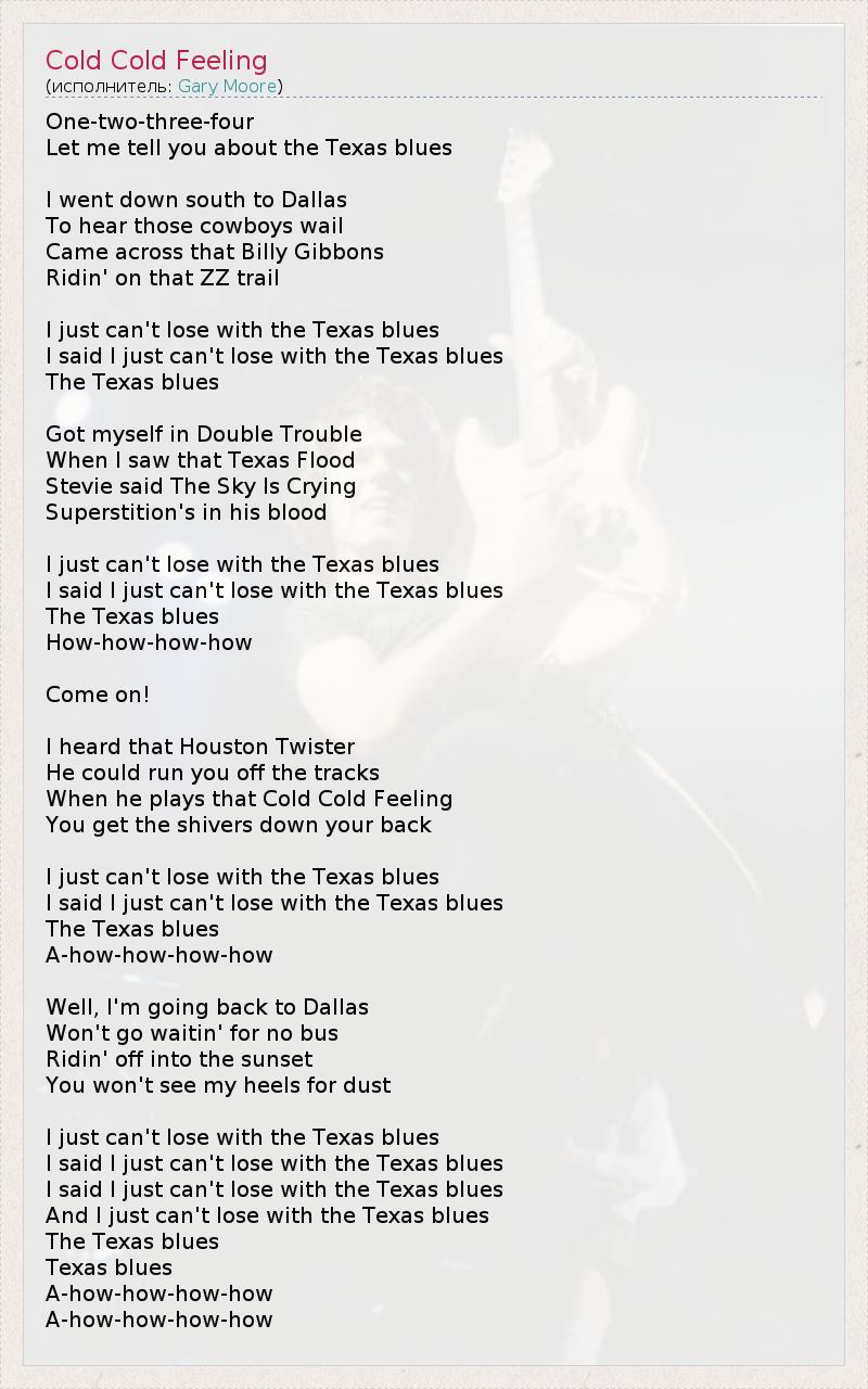 Раз-два- три-четыре Позвольте мне рассказать вам о блюзе Texas Я пошел на юг в Даллас Чтобы услышать эти ковбои плакать Наткнулся что Билли Гиббонс Ridin 'на этой ZZ след Я просто не могу потерять с блюзом Texas Я сказал, что просто не может потерять с блюзом Texas Техасские блюз Получил себя в Double Trouble Когда я увидел , что Техас Наводнение Стиви сказалSky Плачет Суеверие в его крови Я просто не могу потерять с блюзом Texas Я сказал, что просто не может потерять с блюзом Texas Техасские блюз Как -хау -хау , как Давай! Я слышал, что Хьюстон Twister Он мог работать вам с рельсов Когда он играет , что холодные ощущение холода Вы получаете дрожь спине Я просто не могу потерять с блюзом Texas Я сказал, что просто не может потерять с блюзом Texas Техасские блюз -Хау -хау , как - как Ну, я собираюсь вернуться в Даллас Не будем вдаваться ждешь нет автобуса Ridin ' в закат Вы не увидите мои пятки для пыли Я просто не могу потерять с блюзом Texas Я сказал, что просто не может потерять с блюзом Texas Я сказал, что просто не может потерять с блюзом Texas И я просто не могу потерять с блюзом Texas Техасские блюз Texas Blues -Хау -хау , как - как -Хау -хау , как - как