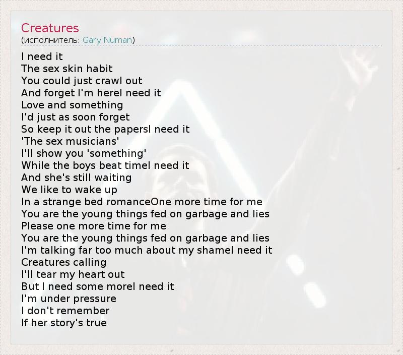 I need it The sex skin habit You could just crawl out And forget I'm hereI need it Love and something I'd just as soon forget So keep it out the papersI need it 'The sex musicians' I'll show you 'something' While the boys beat timeI need it And she's still waiting We like to wake up In a strange bed romanceOne more time for me You are the young things fed on garbage and lies Please one more time for me You are the young things fed on garbage and lies I'm talking far too much about my shameI need it Creatures calling I'll tear my heart out But I need some moreI need it I'm under pressure I don't remember If her story's true