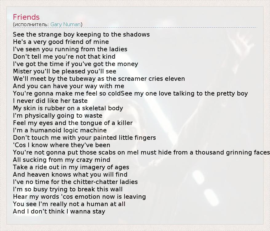 See the strange boy keeping to the shadows He's a very good friend of mine I've seen you running from the ladies Don't tell me you're not that kind I've got the time if you've got the money Mister you'll be pleased you'll see We'll meet by the tubeway as the screamer cries eleven And you can have your way with me You're gonna make me feel so coldSee my one love talking to the pretty boy I never did like her taste My skin is rubber on a skeletal body I'm physically going to waste Feel my eyes and the tongue of a killer I'm a humanoid logic machine Don't touch me with your painted little fingers 'Cos I know where they've been You're not gonna put those scabs on meI must hide from a thousand grinning faces All sucking from my crazy mind Take a ride out in my imagery of ages And heaven knows what you will find I've no time for the chitter-chatter ladies I'm so busy trying to break this wall Hear my words 'cos emotion now is leaving You see I'm really not a human at all And I don't think I wanna stay