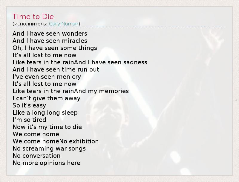 And I have seen wonders And I have seen miracles Oh, I have seen some things It's all lost to me now Like tears in the rainAnd I have seen sadness And I have seen time run out I've even seen men cry It's all lost to me now Like tears in the rainAnd my memories I can't give them away So it's easy Like a long long sleep I'm so tired Now it's my time to die Welcome home Welcome homeNo exhibition No screaming war songs No conversation No more opinions here