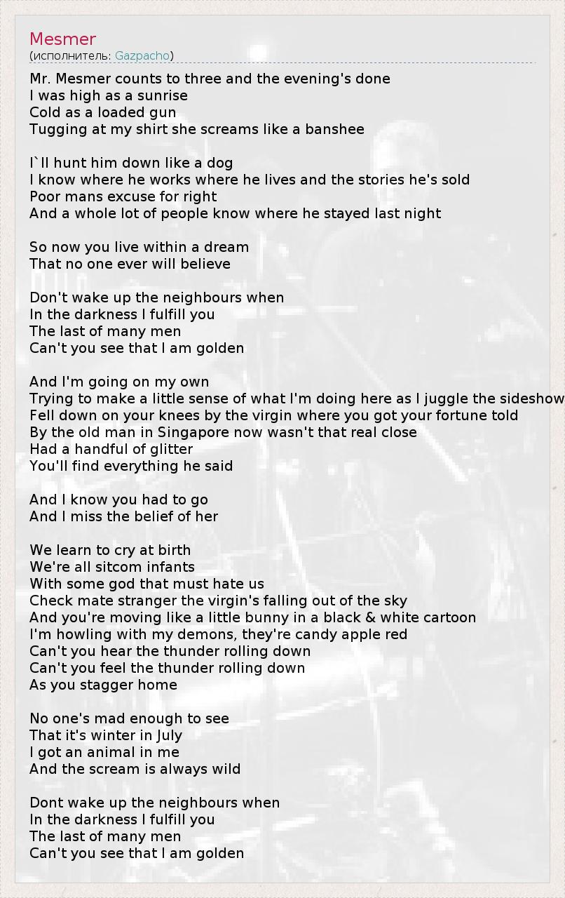 Mr. Mesmer counts to three and the evening's done I was high as a sunrise Cold as a loaded gun Tugging at my shirt she screams like a banshee I`ll hunt him down like a dog I know where he works where he lives and the stories he's sold Poor mans excuse for right And a whole lot of people know where he stayed last night So now you live within a dream That no one ever will believe Don't wake up the neighbours when In the darkness I fulfill you The last of many men Can't you see that I am golden And I'm going on my own Trying to make a little sense of what I'm doing here as I juggle the sideshow Fell down on your knees by the virgin where you got your fortune told By the old man in Singapore now wasn't that real close Had a handful of glitter You'll find everything he said And I know you had to go And I miss the belief of her We learn to cry at birth We're all sitcom infants With some god that must hate us Check mate stranger the virgin's falling out of the sky And you're moving like a little bunny in a black & white cartoon I'm howling with my demons, they're candy apple red Can't you hear the thunder rolling down Can't you feel the thunder rolling down As you stagger home No one's mad enough to see That it's winter in July I got an animal in me And the scream is always wild Dont wake up the neighbours when In the darkness I fulfill you The last of many men Can't you see that I am golden