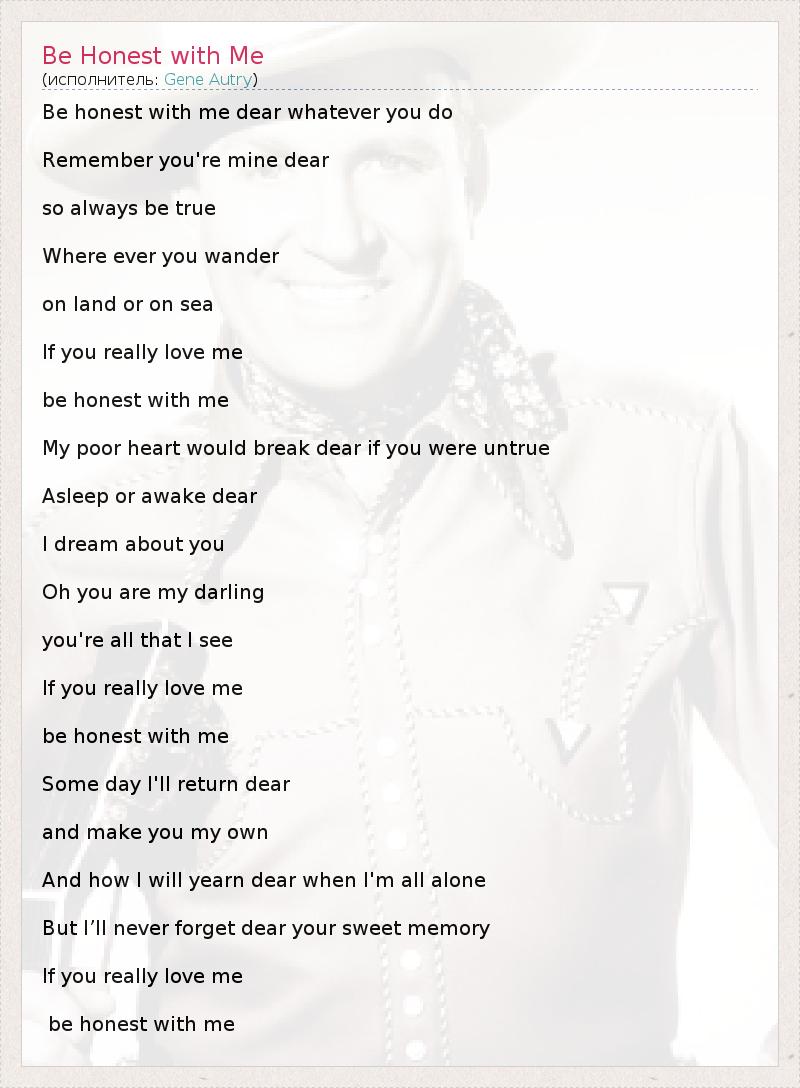 Be honest with me dear whatever you do Remember you're mine dear so always be true Where ever you wander on land or on sea If you really love me be honest with me My poor heart would break dear if you were untrue Asleep or awake dear I dream about you Oh you are my darling you're all that I see If you really love me be honest with me Some day I'll return dear and make you my own And how I will yearn dear when I'm all alone But I’ll never forget dear your sweet memory If you really love me be honest with me