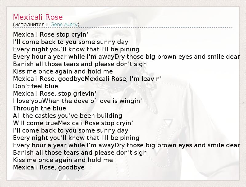 Mexicali Rose stop cryin' I'll come back to you some sunny day Every night you'll know that I'll be pining Every hour a year while I'm awayDry those big brown eyes and smile dear Banish all those tears and please don't sigh Kiss me once again and hold me Mexicali Rose, goodbyeMexicali Rose, I'm leavin' Don't feel blue Mexicali Rose, stop grievin' I love youWhen the dove of love is wingin' Through the blue All the castles you've been building Will come trueMexicali Rose stop cryin' I'll come back to you some sunny day Every night you'll know that I'll be pining Every hour a year while I'm awayDry those big brown eyes and smile dear Banish all those tears and please don't sigh Kiss me once again and hold me Mexicali Rose, goodbye