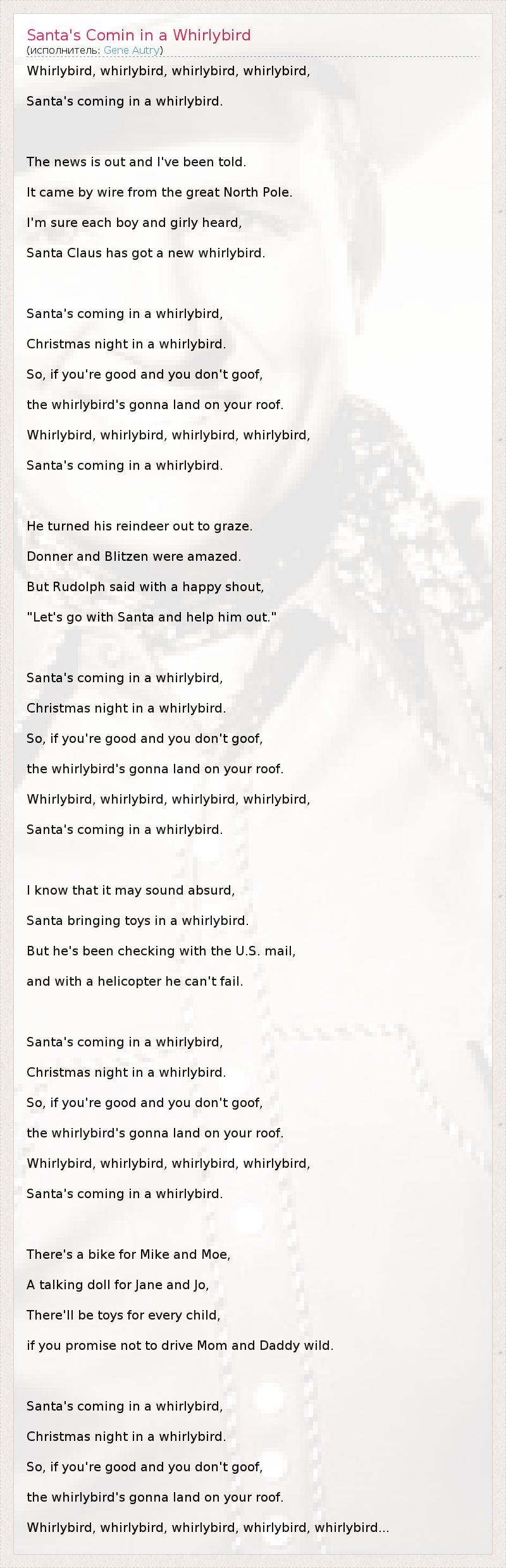 А как ты думаешь, о чем песня "Santa's Comin in a Whirlybird" ?