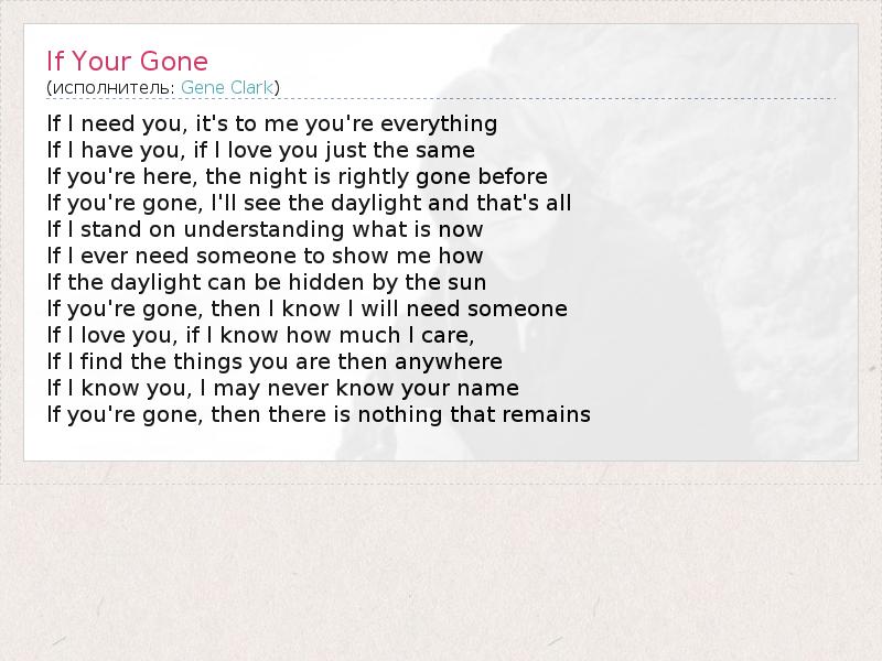 If I need you, it's to me you're everything If I have you, if I love you just the same If you're here, the night is rightly gone before If you're gone, I'll see the daylight and that's all If I stand on understanding what is now If I ever need someone to show me how If the daylight can be hidden by the sun If you're gone, then I know I will need someone If I love you, if I know how much I care, If I find the things you are then anywhere If I know you, I may never know your name If you're gone, then there is nothing that remains