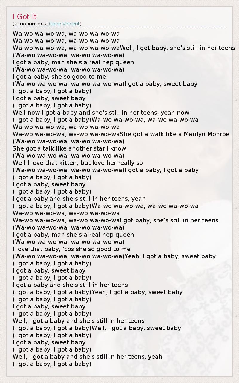Wa-wo wa-wo-wa, wa-wo wa-wo-wa Wa-wo wa-wo-wa, wa-wo wa-wo-wa Wa-wo wa-wo-wa, wa-wo wa-wo-waWell, I got baby, she's still in her teens (Wa-wo wa-wo-wa, wa-wo wa-wo-wa) I got a baby, man she's a real hep queen (Wa-wo wa-wo-wa, wa-wo wa-wo-wa) I got a baby, she so good to me (Wa-wo wa-wo-wa, wa-wo wa-wo-wa)I got a baby, sweet baby (I got a baby, I got a baby) I got a baby, sweet baby (I got a baby, I got a baby) Well now I got a baby and she's still in her teens, yeah now (I got a baby, I got a baby)Wa-wo wa-wo-wa, wa-wo wa-wo-wa Wa-wo wa-wo-wa, wa-wo wa-wo-wa Wa-wo wa-wo-wa, wa-wo wa-wo-waShe got a walk like a Marilyn Monroe (Wa-wo wa-wo-wa, wa-wo wa-wo-wa) She got a talk like another star I know (Wa-wo wa-wo-wa, wa-wo wa-wo-wa) Well I love that kitten, but love her really so (Wa-wo wa-wo-wa, wa-wo wa-wo-wa)I got a baby, I got a baby (I got a baby, I got a baby) I got a baby, sweet baby (I got a baby, I got a baby) I got a baby and she's still in her teens, yeah (I got a baby, I got a baby)Wa-wo wa-wo-wa, wa-wo wa-wo-wa Wa-wo wa-wo-wa, wa-wo wa-wo-wa Wa-wo wa-wo-wa, wa-wo wa-wo-waI got baby, she's still in her teens (Wa-wo wa-wo-wa, wa-wo wa-wo-wa) I got a baby, man she's a real hep queen (Wa-wo wa-wo-wa, wa-wo wa-wo-wa) I love that baby, 'cos she so good to me (Wa-wo wa-wo-wa, wa-wo wa-wo-wa)Yeah, I got a baby, sweet baby (I got a baby, I got a baby) I got a baby, sweet baby (I got a baby, I got a baby) I got a baby and she's still in her teens (I got a baby, I got a baby)Yeah, I got a baby, sweet baby (I got a baby, I got a baby) I got a baby, sweet baby (I got a baby, I got a baby) Well, I got a baby and she's still in her teens (I got a baby, I got a baby)Well, I got a baby, sweet baby (I got a baby, I got a baby) I got a baby, sweet baby (I got a baby, I got a baby) Well, I got a baby and she's still in her teens, yeah (I got a baby, I got a baby)