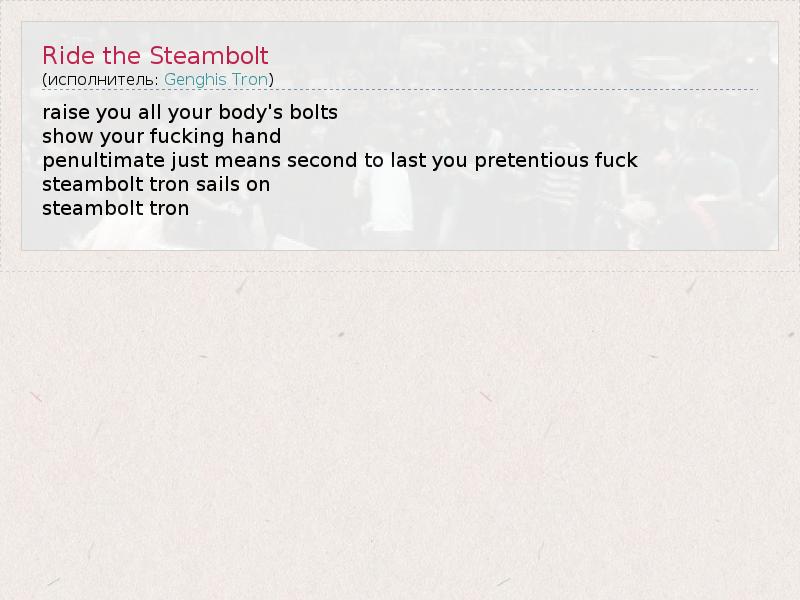 А как ты думаешь, о чем песня "Ride the Steambolt" ?