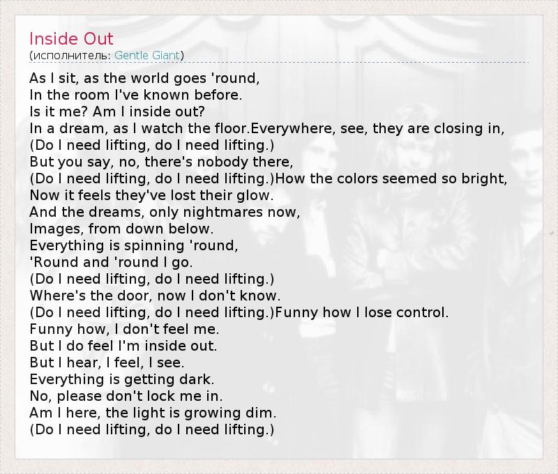 As I sit, as the world goes 'round, In the room I've known before. Is it me? Am I inside out? In a dream, as I watch the floor.Everywhere, see, they are closing in, (Do I need lifting, do I need lifting.) But you say, no, there's nobody there, (Do I need lifting, do I need lifting.)How the colors seemed so bright, Now it feels they've lost their glow. And the dreams, only nightmares now, Images, from down below. Everything is spinning 'round, 'Round and 'round I go. (Do I need lifting, do I need lifting.) Where's the door, now I don't know. (Do I need lifting, do I need lifting.)Funny how I lose control. Funny how, I don't feel me. But I do feel I'm inside out. But I hear, I feel, I see. Everything is getting dark. No, please don't lock me in. Am I here, the light is growing dim. (Do I need lifting, do I need lifting.)