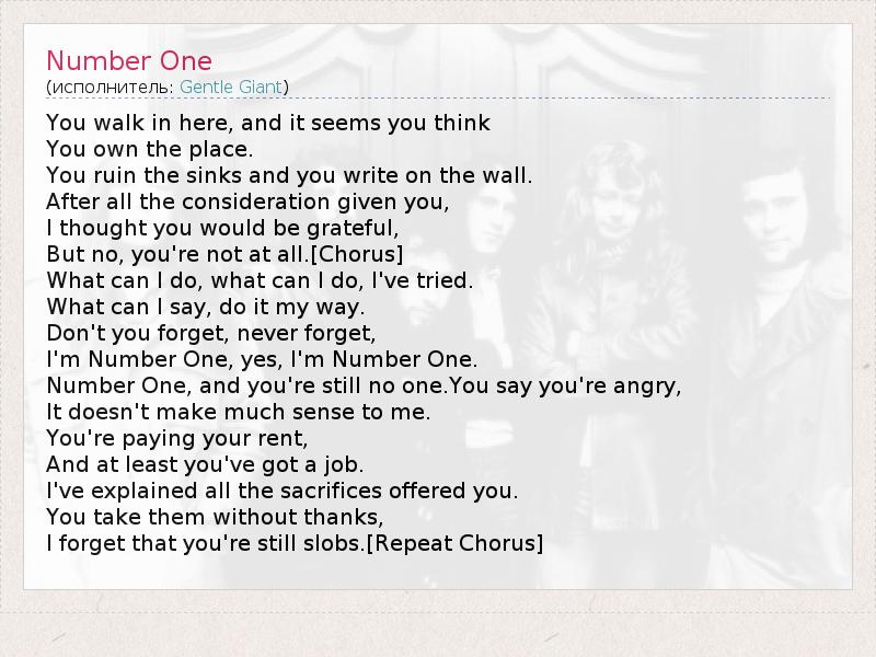 You walk in here, and it seems you think You own the place. You ruin the sinks and you write on the wall. After all the consideration given you, I thought you would be grateful, But no, you're not at all.[Chorus] What can I do, what can I do, I've tried. What can I say, do it my way. Don't you forget, never forget, I'm Number One, yes, I'm Number One. Number One, and you're still no one.You say you're angry, It doesn't make much sense to me. You're paying your rent, And at least you've got a job. I've explained all the sacrifices offered you. You take them without thanks, I forget that you're still slobs.[Repeat Chorus]