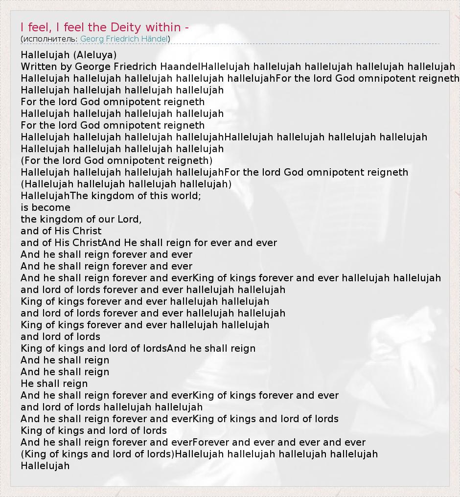 Hallelujah (Aleluya) Written by George Friedrich HaandelHallelujah hallelujah hallelujah hallelujah hallelujah Hallelujah hallelujah hallelujah hallelujah hallelujahFor the lord God omnipotent reigneth Hallelujah hallelujah hallelujah hallelujah For the lord God omnipotent reigneth Hallelujah hallelujah hallelujah hallelujah For the lord God omnipotent reigneth Hallelujah hallelujah hallelujah hallelujahHallelujah hallelujah hallelujah hallelujah Hallelujah hallelujah hallelujah hallelujah (For the lord God omnipotent reigneth) Hallelujah hallelujah hallelujah hallelujahFor the lord God omnipotent reigneth (Hallelujah hallelujah hallelujah hallelujah) HallelujahThe kingdom of this world; is become the kingdom of our Lord, and of His Christ and of His ChristAnd He shall reign for ever and ever And he shall reign forever and ever And he shall reign forever and ever And he shall reign forever and everKing of kings forever and ever hallelujah hallelujah and lord of lords forever and ever hallelujah hallelujah King of kings forever and ever hallelujah hallelujah and lord of lords forever and ever hallelujah hallelujah King of kings forever and ever hallelujah hallelujah and lord of lords King of kings and lord of lordsAnd he shall reign And he shall reign And he shall reign He shall reign And he shall reign forever and everKing of kings forever and ever and lord of lords hallelujah hallelujah And he shall reign forever and everKing of kings and lord of lords King of kings and lord of lords And he shall reign forever and everForever and ever and ever and ever (King of kings and lord of lords)Hallelujah hallelujah hallelujah hallelujah Hallelujah