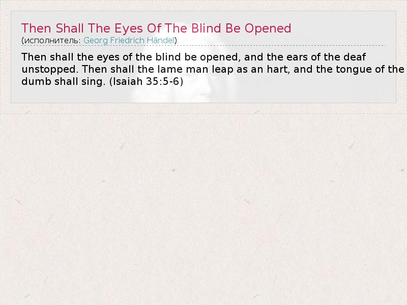 Then shall the eyes of the blind be opened, and the ears of the deaf unstopped. Then shall the lame man leap as an hart, and the tongue of the dumb shall sing. (Isaiah 35:5-6)
