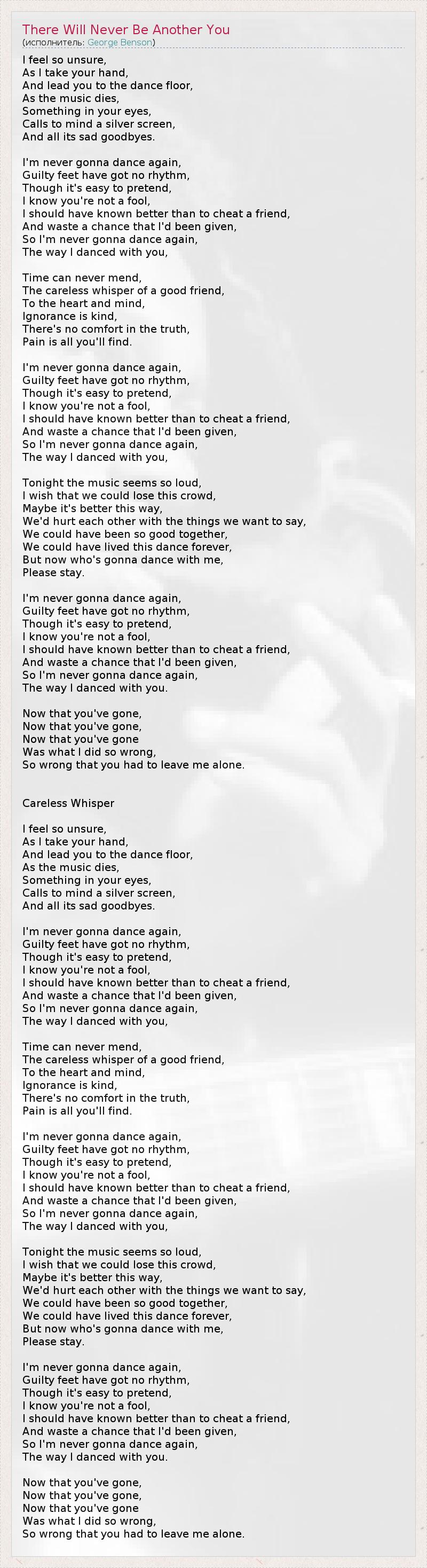 I feel so unsure, As I take your hand, And lead you to the dance floor, As the music dies, Something in your eyes, Calls to mind a silver screen, And all its sad goodbyes. I'm never gonna dance again, Guilty feet have got no rhythm, Though it's easy to pretend, I know you're not a fool, I should have known better than to cheat a friend, And waste a chance that I'd been given, So I'm never gonna dance again, The way I danced with you, Time can never mend, The careless whisper of a good friend, To the heart and mind, Ignorance is kind, There's no comfort in the truth, Pain is all you'll find. I'm never gonna dance again, Guilty feet have got no rhythm, Though it's easy to pretend, I know you're not a fool, I should have known better than to cheat a friend, And waste a chance that I'd been given, So I'm never gonna dance again, The way I danced with you, Tonight the music seems so loud, I wish that we could lose this crowd, Maybe it's better this way, We'd hurt each other with the things we want to say, We could have been so good together, We could have lived this dance forever, But now who's gonna dance with me, Please stay. I'm never gonna dance again, Guilty feet have got no rhythm, Though it's easy to pretend, I know you're not a fool, I should have known better than to cheat a friend, And waste a chance that I'd been given, So I'm never gonna dance again, The way I danced with you. Now that you've gone, Now that you've gone, Now that you've gone Was what I did so wrong, So wrong that you had to leave me alone. Careless Whisper I feel so unsure, As I take your hand, And lead you to the dance floor, As the music dies, Something in your eyes, Calls to mind a silver screen, And all its sad goodbyes. I'm never gonna dance again, Guilty feet have got no rhythm, Though it's easy to pretend, I know you're not a fool, I should have known better than to cheat a friend, And waste a chance that I'd been given, So I'm never gonna dance again, The way I danced with you, Time can never mend, The careless whisper of a good friend, To the heart and mind, Ignorance is kind, There's no comfort in the truth, Pain is all you'll find. I'm never gonna dance again, Guilty feet have got no rhythm, Though it's easy to pretend, I know you're not a fool, I should have known better than to cheat a friend, And waste a chance that I'd been given, So I'm never gonna dance again, The way I danced with you, Tonight the music seems so loud, I wish that we could lose this crowd, Maybe it's better this way, We'd hurt each other with the things we want to say, We could have been so good together, We could have lived this dance forever, But now who's gonna dance with me, Please stay. I'm never gonna dance again, Guilty feet have got no rhythm, Though it's easy to pretend, I know you're not a fool, I should have known better than to cheat a friend, And waste a chance that I'd been given, So I'm never gonna dance again, The way I danced with you. Now that you've gone, Now that you've gone, Now that you've gone Was what I did so wrong, So wrong that you had to leave me alone.