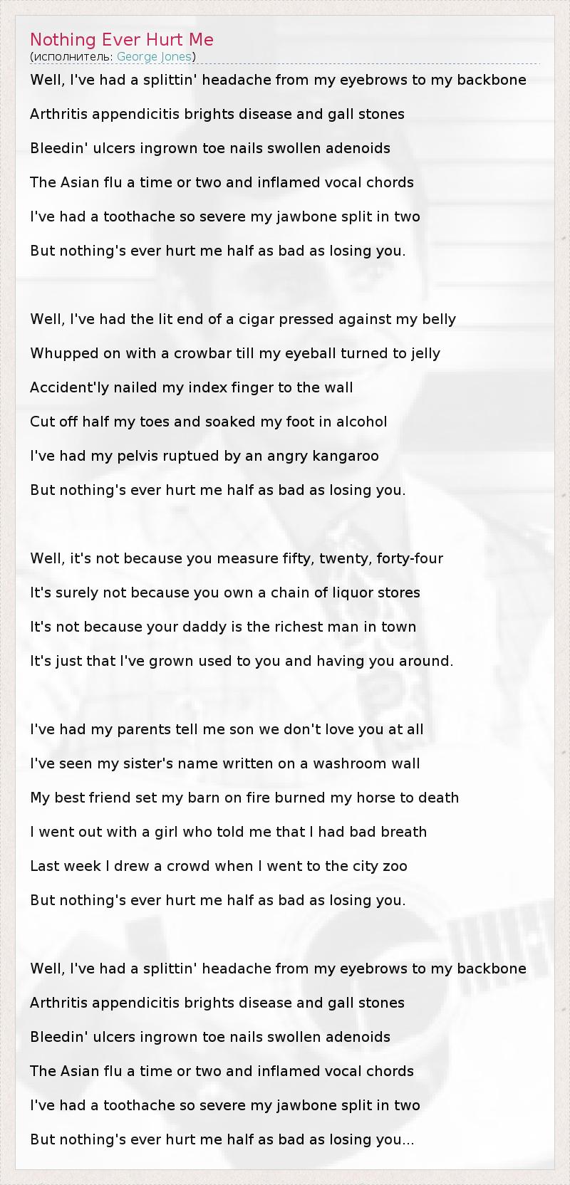 Well, I've had a splittin' headache from my eyebrows to my backbone Arthritis appendicitis brights disease and gall stones Bleedin' ulcers ingrown toe nails swollen adenoids The Asian flu a time or two and inflamed vocal chords I've had a toothache so severe my jawbone split in two But nothing's ever hurt me half as bad as losing you. Well, I've had the lit end of a cigar pressed against my belly Whupped on with a crowbar till my eyeball turned to jelly Accident'ly nailed my index finger to the wall Cut off half my toes and soaked my foot in alcohol I've had my pelvis ruptued by an angry kangaroo But nothing's ever hurt me half as bad as losing you. Well, it's not because you measure fifty, twenty, forty-four It's surely not because you own a chain of liquor stores It's not because your daddy is the richest man in town It's just that I've grown used to you and having you around. I've had my parents tell me son we don't love you at all I've seen my sister's name written on a washroom wall My best friend set my barn on fire burned my horse to death I went out with a girl who told me that I had bad breath Last week I drew a crowd when I went to the city zoo But nothing's ever hurt me half as bad as losing you. Well, I've had a splittin' headache from my eyebrows to my backbone Arthritis appendicitis brights disease and gall stones Bleedin' ulcers ingrown toe nails swollen adenoids The Asian flu a time or two and inflamed vocal chords I've had a toothache so severe my jawbone split in two But nothing's ever hurt me half as bad as losing you...