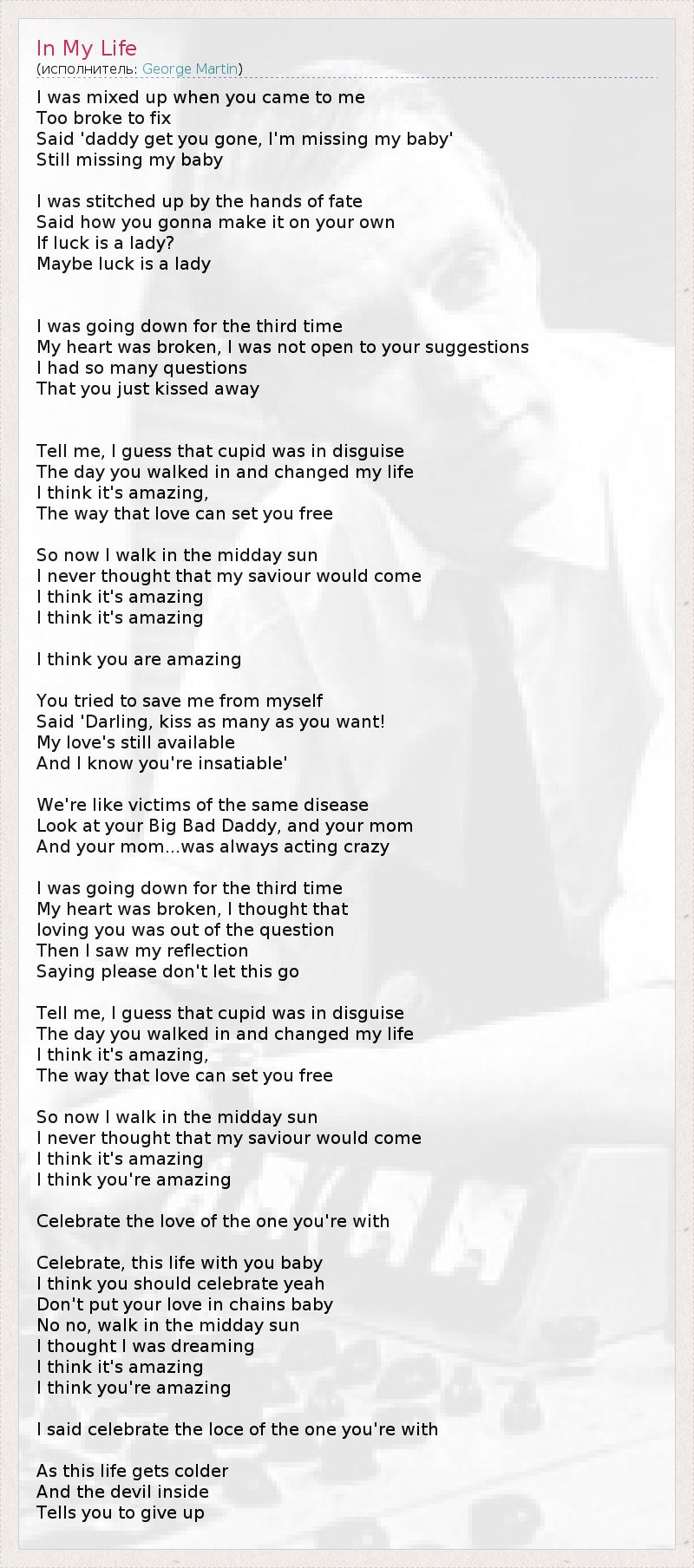 Когда ты появилась в моей жизни, Я совсем запутался и, казалось, нет выхода назад Я говорил: «Оставь меня старик, я в печали, Скучаю по моей девочке, всё ещё скучаю по ней» Судьба приготовила для меня петлю, Ненавящего интересуясь, Как же это я собираюсь сам со всем справиться А вдруг удача – это девушка? Нет, а серьёзно – может это девушка… Накрылась медным тазом моя жизнь уже в третий раз Моё сердце было разбито, Ты была сосем не вовремя со своими предложениями А ведь у меня была ещё куча вопросов, Но ты поцеловала меня и они тупо отпали сами собой Колись, ты и была купидоном, только под личиной девушки, В тот самый день, изменивший мою жизнь До чего удивительно, Как вот так запросто любовь может освободить тебя И хоть сейчас я и разгуливаю под ярким солнышком, Раньше и не подумал бы, что придёт-таки спасение, По-моему, удивительно Я считаю, что это удивительно И думаю, что ты тоже удивительная Ты пыталась защитить меня от меня самого, Сказав «Ты целуй меня уже, я ведь взрослая везде…» Знаю-знаю, какая ты ненасытная, Но сохраняй спокойствие, меня ещё много, тебе хватит Мы словно друзья по несчастью Достаточно посмотреть на твоего большого и страшного отца А мамаша? Про неё я вообще молчу, шиза - да и только… Накрылась медным тазом моя жизнь аж в третий раз Моё сердце было разбито, я и не думал, что У нас хоть что-то получиться… Но вдруг увидел своё отражение, которое просило «Не упусти свой шанс на счастье, будь человеком!..» Колись, ты и была купидоном, только под личиной девушки, В тот самый день, изменивший мою жизнь До чего удивительно, Как вот так запросто любовь может освободить тебя И хоть сейчас я и разгуливаю под ярким солнышком, Раньше и не подумал бы, что придёт-таки спасение, По-моему, удивительно И думаю, ты удивительная Возрадуйся же любви того, кто рядом с тобой Как же я рад, что мы вместе, детка Радуйся тому, что мы идём рука об руку по этой жизни, о да И не засовывай ты свои чувства в глупые рамки, не надо Гуляя в лучах яркого солнца, Думал меня глючит, сон наяву, так сказать По-моему, удивительно И думаю, ты удивительная Отпразднуй потерю того, с кем была Т.к. жить становится холоднее день ото дня, Да и дьявол внутри Советует завязывать со всем этим…