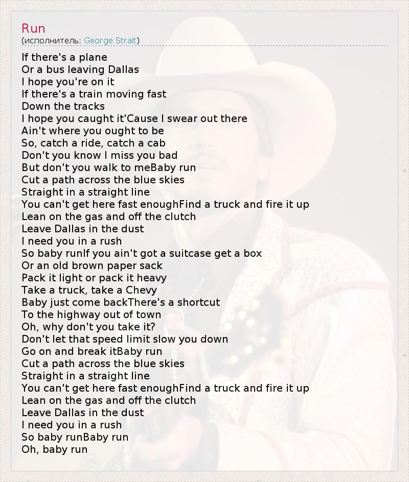 If there's a plane Or a bus leaving Dallas I hope you're on it If there's a train moving fast Down the tracks I hope you caught it'Cause I swear out there Ain't where you ought to be So, catch a ride, catch a cab Don't you know I miss you bad But don't you walk to meBaby run Cut a path across the blue skies Straight in a straight line You can't get here fast enoughFind a truck and fire it up Lean on the gas and off the clutch Leave Dallas in the dust I need you in a rush So baby runIf you ain't got a suitcase get a box Or an old brown paper sack Pack it light or pack it heavy Take a truck, take a Chevy Baby just come backThere's a shortcut To the highway out of town Oh, why don't you take it? Don't let that speed limit slow you down Go on and break itBaby run Cut a path across the blue skies Straight in a straight line You can't get here fast enoughFind a truck and fire it up Lean on the gas and off the clutch Leave Dallas in the dust I need you in a rush So baby runBaby run Oh, baby run
