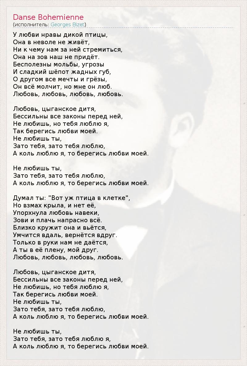 У любви нравы дикой птицы, Она в неволе не живёт, Ни к чему нам за ней стремиться, Она на зов наш не придёт. Бесполезны мольбы, угрозы И сладкий шёпот жадных губ, О другом все мечты и грёзы, Он всё молчит, но мне он люб. Любовь, любовь, любовь, любовь. Любовь, цыганское дитя, Бессильны все законы перед ней, Не любишь, но тебя люблю я, Так берегись любви моей. Не любишь ты, Зато тебя, зато тебя люблю, А коль люблю я, то берегись любви моей. Не любишь ты, Зато тебя, зато тебя люблю, А коль люблю я, то берегись любви моей. Думал ты: "Вот уж птица в клетке", Но взмах крыла, и нет её, Упорхнула любовь навеки, Зови и плачь напрасно всё. Близко кружит она и вьётся, Умчится вдаль, вернётся вдруг. Только в руки нам не даётся, А ты в её плену, мой друг. Любовь, любовь, любовь, любовь. Любовь, цыганское дитя, Бессильны все законы перед ней, Не любишь, но тебя люблю я, Так берегись любви моей. Не любишь ты, Зато тебя, зато тебя люблю, А коль люблю я, то берегись любви моей. Не любишь ты, Зато тебя, зато тебя люблю я, А коль люблю я, то берегись любви моей.