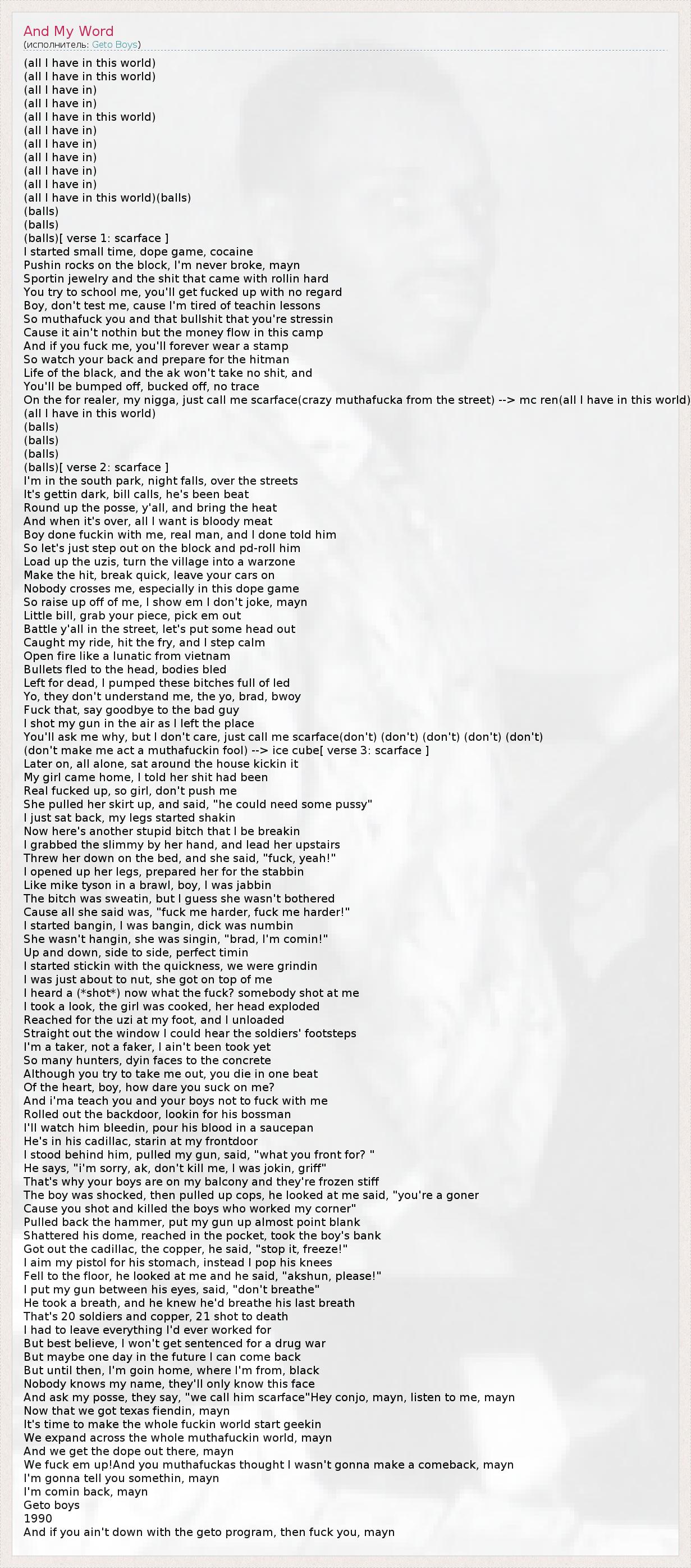 On the for realer, my nigga, just call me scarface(crazy muthafucka from the street) --> mc ren(all I have in this world)