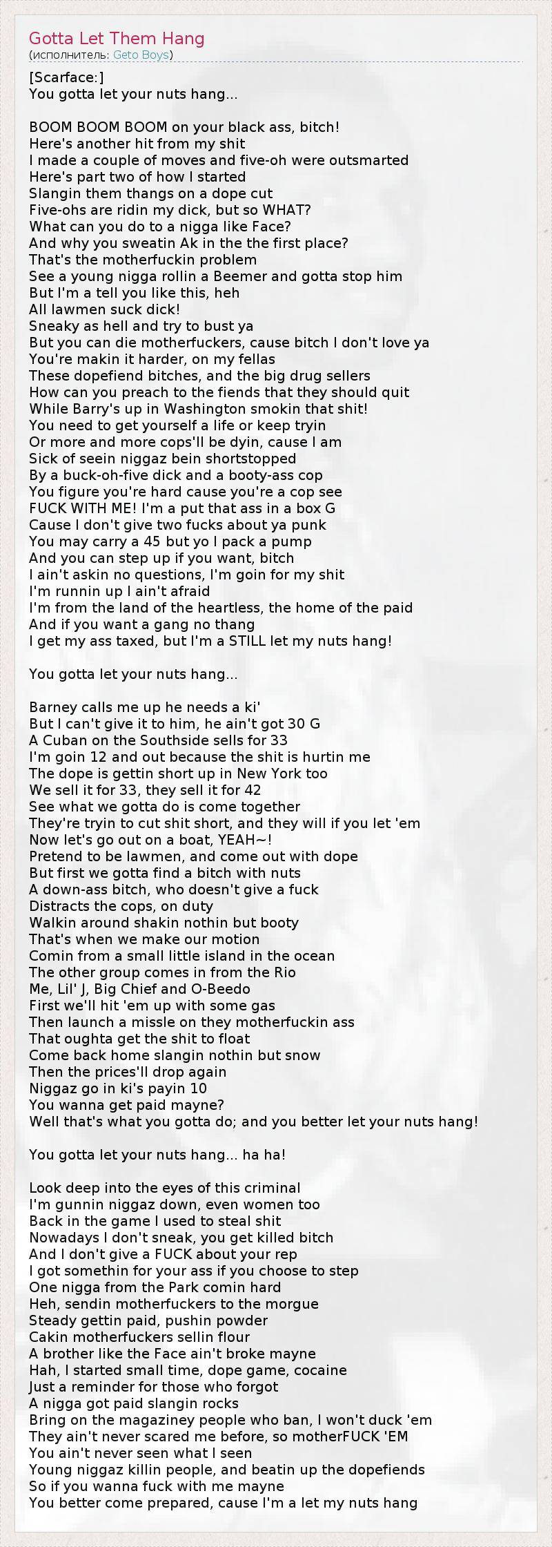[Лицо со шрамом:] Вы должны пусть ваши орехи висят ... Boom Boom Boom на ваших черных задницу, сука! Вот еще один хит от моего дерьма Я сделал пару шагов и пяти-ой были перехитрил Вот вторая часть, как я начал Slangin их Thangs на разрезе допинг Пять-охи которые Ridin мой член, но что с того? Что вы можете сделать, чтобы нигер, как лицо? И почему вы Sweatin Ak в первую очередь? Это проблема motherfuckin См молодой ниггер Rollin Бимер и должен его остановить Но я расскажу вам, как это, хе-хе Все lawmen сосать хуй! Трусливый, как ад, и попытаться бюст Я. Но вы можете умереть ублюдки, вызвать сука, я не люблю Я. Вы Макин труднее, на моих парней Эти dopefiend суки, и большие продавцы наркотиков Как вы можете проповедовать изверги, что они должны бросить В то время как до Барри в Вашингтоне или курит это дерьмо! Вы должны получить себе жизнь или сохранить сделаешь Или более cops'll быть умираю, потому что я являюсь Больные Seein ниггеры Бейн shortstopped По доллар-о-пять хуй и добычей задницу КС Вы полагаете, что вы жесткий потому что ты полицейский см Ебать СО МНОЙ! Я положил, что задница в окне G Причина я не даю два трахается о я панк Вы можете осуществлять 45 лет, но я упаковать насос И вы можете уйти, если вы хотите, сука Я не не спрашивал никаких вопросов, я идешь на мое дерьмо Я бежит до я не боюсь Я из земли бессердечный, дом оплачивается И если вы не хотите, банда не Тханг Я получаю мою задницу облагаться налогом, но я ВСЕ ЕЩЕ пусть мои орехи висят! Вы должны пусть ваши орехи висят ... Барни называет меня он нуждается в ки " Но я не могу дать ему, он не получил 30 г Кубинский на Саутсайд продает 33 Я идешь 12 и из-за дерьмо это hurtin меня Допинг получаешь короткий в Нью-Йорке тоже Мы продаем его за 33, они продают его за 42 Посмотрите, что мы должны сделать, это прийти вместе Они сделаешь, чтобы сократить дерьмо короткий, и они будут, если вы Let 'Em Теперь давайте выходить на лодке, да ~! Представьте, что будет lawmen, и выйти с допингом Но сначала мы должны найти суку с орехами Вниз задницу сука, кто не дают ебать Отвлекает полицейских на дежурстве Ходит туда затрясло ничего, но трофеев Вот когда мы делаем наш движение Comin из маленьком острове в океане Другая группа поступает из Рио Me, J Lil ', Большой начальник и О-Beedo Сначала мы Hit 'Em с некоторыми газа Затем запустить Ракета на них motherfuckin задницу Это Oughta получить дерьмо плавать Возвращайтесь домой slangin ничего, но снега Тогда падение prices'll снова Ниггеры идти в Payin Ки 10 Вы хотите платят Mayne? Ну вот что ты должен делать, и вы лучше пусть ваши орехи повесить! Вы должны пусть ваши орехи повесить ... ха-ха! Посмотрите глубоко в глазах этого преступника Я gunnin ниггеры вниз, даже женщины тоже Вернуться в игре я использовал, чтобы украсть дерьмо В настоящее время я не пробраться, вас убьют сука И я не даю ебать о вашем респ Я получил что-нибудь для своей задницы, если вы решите шаг Один ниггер из парка пущу трудно Хех, Sendin ублюдки в морг Устойчивый получаешь заплатили, Пущин порошок Cakin ублюдки Sellin муку Брат, как лицо, не сломался Майн Ха, я начал небольшой тайм, допинг игры, кокаин Просто напоминание для тех, кто забыл Ниггер платили slangin камни Не Принесите на magaziney людей, которые запрещают, я буду утка 'Em Они не никогда не испугало меня и раньше, так motherFUCK 'Em Вы не разу не видел, что я видел Молодые ниггеры убивают людей, и beatin вверх dopefiends Так что, если вы хотите ебать со мной Майн Вы лучше подготовиться, потому 