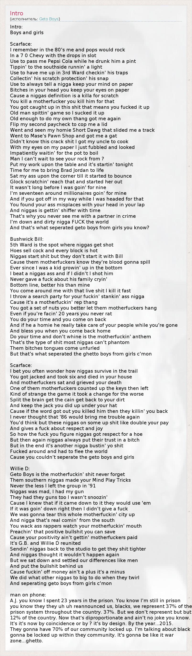 Это интересно:Geto Boys известно как трио Bushwick Bill, Scarface и Willie D., но так уж исторически сложилось, что фундамент группы закладывали совсем другие люди и называли они себя не Geto Boys, а Ghetto Boys (что выглядело безукоризненно, исходя из орфографических соображений). В 1986 году преуспевающий бизнесмен и шоумен Джеймс Смит (по прозвищу LilТ J), который владел знаменитым хип-хоп-лейблом Rap-A-Lot Records, принял историческое решение... продолжение