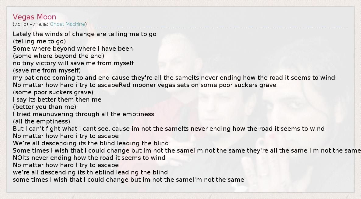 Это интересно:Ghost Machine собрались вместе, когда вокалист Айвен Муди и гитарист Джон Стивенс встретились на радио XM. Группа Айвена Motograter, ранее работавшая с Elektra Record, должна была выступать на стадионе, когда Джона, представителя XM Radio, впечатлил вокал Айвена. Он подумал, что это именно тот, кто ему нужен для осуществления нового проекта.После нескольких попыток записи были привлечены барабанщик Крис... продолжение