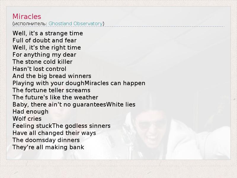 Well, it's a strange time Full of doubt and fear Well, it's the right time For anything my dear The stone cold killer Hasn't lost control And the big bread winners Playing with your doughMiracles can happen The fortune teller screams The future's like the weather Baby, there ain't no guaranteesWhite lies Had enough Wolf cries Feeling stuckThe godless sinners Have all changed their ways The doomsday dinners They're all making bank