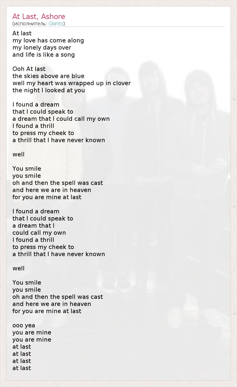 At last my love has come along my lonely days over and life is like a song Ooh At last the skies above are blue well my heart was wrapped up in clover the night I looked at you I found a dream that I could speak to a dream that I could call my own I found a thrill to press my cheek to a thrill that I have never known well You smile you smile oh and then the spell was cast and here we are in heaven for you are mine at last I found a dream that I could speak to a dream that I could call my own I found a thrill to press my cheek to a thrill that I have never known well You smile you smile oh and then the spell was cast and here we are in heaven for you are mine at last ooo yea you are mine you are mine at last at last at last at last