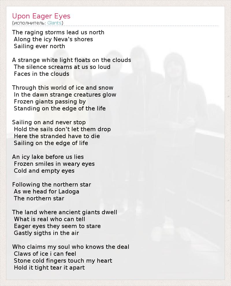 А как ты думаешь, о чем песня "Upon Eager Eyes" ?
