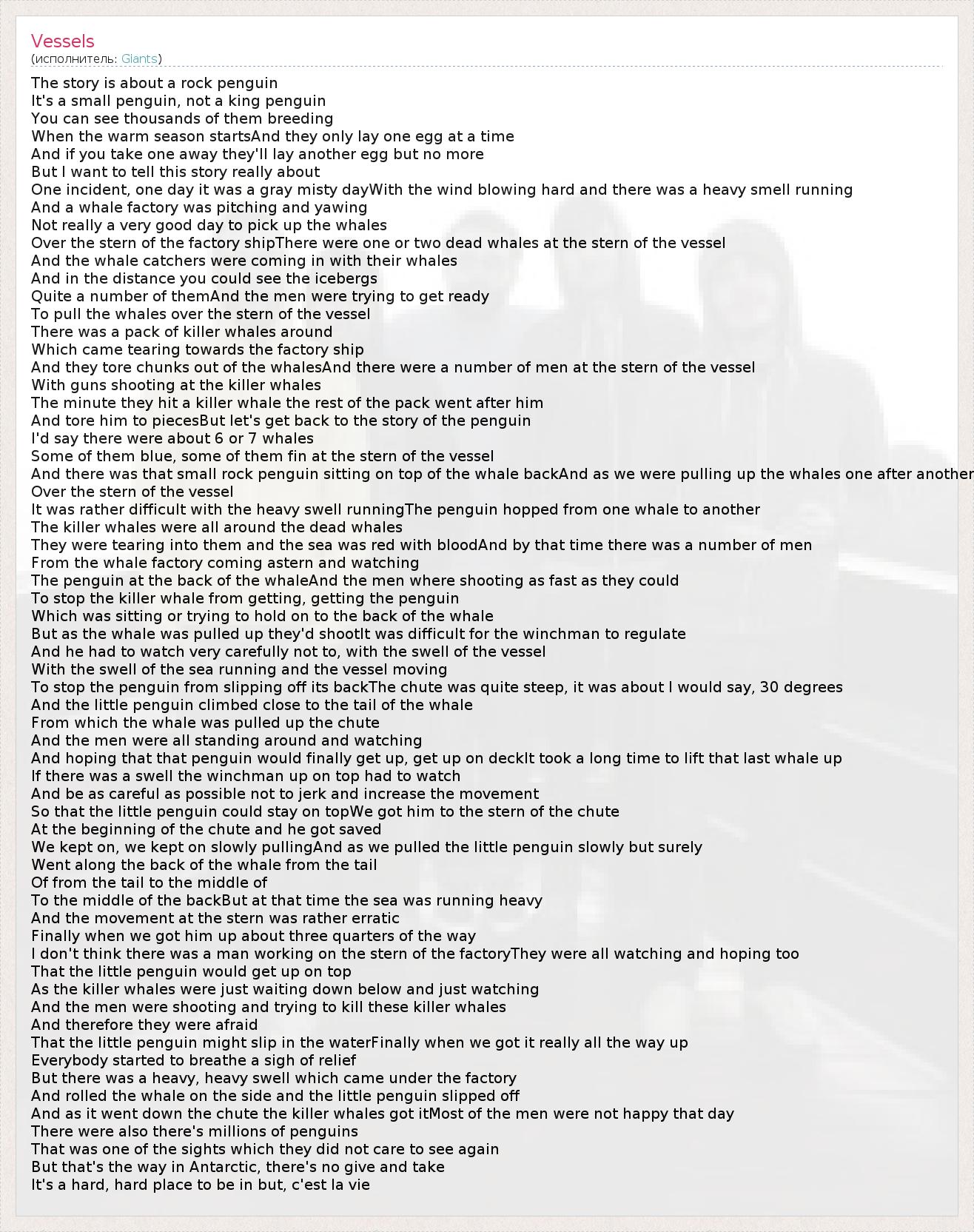 Это интересно:Giants, группа из Cedar Falls, штат Iowa играющая инструментальный пост-рок. Образована летом 2005 года.Members:Heath Hospodarsky - гитараJames Lyle - гитараSteve Carlson - гитараDave Livingston - басDrew Gabbert - ударныеDiscographyАльбомы: They, The Undeserving - (CD, Medical Abuse Records, 2007) They, The Undeserving - (12", The Mylene Sheath, 2008) Old Stories - (CD and LP, Cavity Records, 2008)EPs Giants - (CD, self released, 2005) OOP... продолжение
