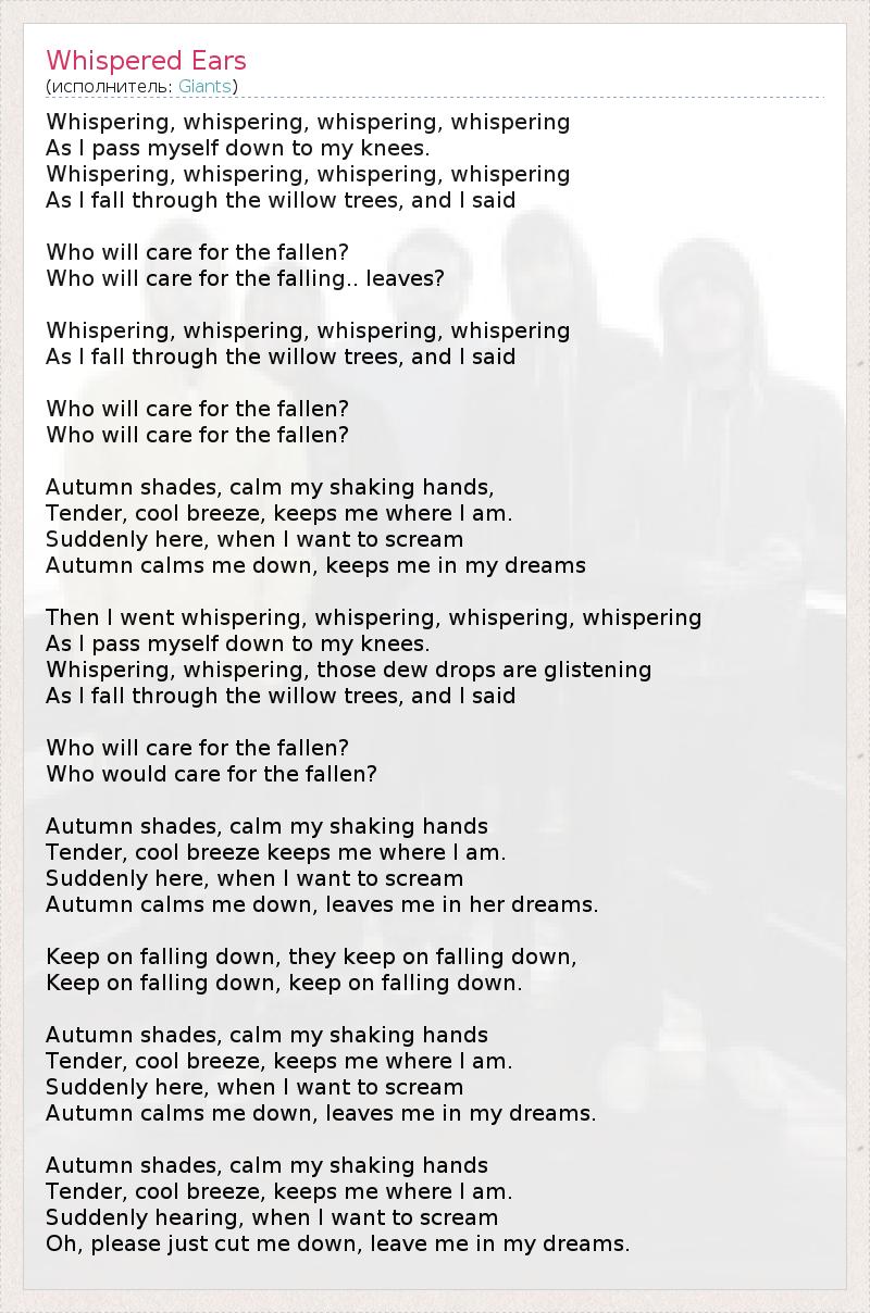 Я шепчу, шепчу, шепчу, шепчу, Преклоняя колени. Шепчу, шепчу, шепчу, шепчу, Падая сквозь ивовые ветви. И я спросил Кто же позаботится о падших? Кому есть дело до падающих... листьев? Я шепчу, шепчу, шепчу, шепчу Падая сквозь ивовые ветви. И я спросил: Кто позаботится о падших? Кому есть до них дело? Осенний сумрак уймет дрожь моих рук, Нежный, прохладный ветер, удержит меня на месте. Внезапно, когда мне захочется кричать, Осень успокоит меня, позволит мне и дальше жить мечтами. И я продолжил шептать, шептать, шептать, шептать, Опускаясь на колени. Я шепчу, шепчу, а роса так сверкает, Когда я падаю сквозь ивовые ветви. И я спросил Кто позаботится о падших? Кому есть до них дело? Осенний сумрак уймет дрожь моих рук, Нежный, прохладный ветер, удержит меня на месте. Внезапно, когда мне захочется кричать, Осень успокоит меня, позволит мне и дальше жить мечтами. Продолжают падать вниз, они продолжают падать, Продолжают падать, продолжают падать. Осенний сумрак уймет дрожь моих рук, Нежный, прохладный ветер, удержит меня на месте. Внезапно, когда мне захочется кричать, Осень успокоит меня, позволит мне и дальше жить мечтами. Осенний сумрак уймет дрожь моих рук, Нежный, прохладный ветер, удержит меня на месте. Внезапно обретаю слух, когда мне хочется кричать, О, пожалуйста, замедли мое падение, позволь мне остаться в моих мечтах.
